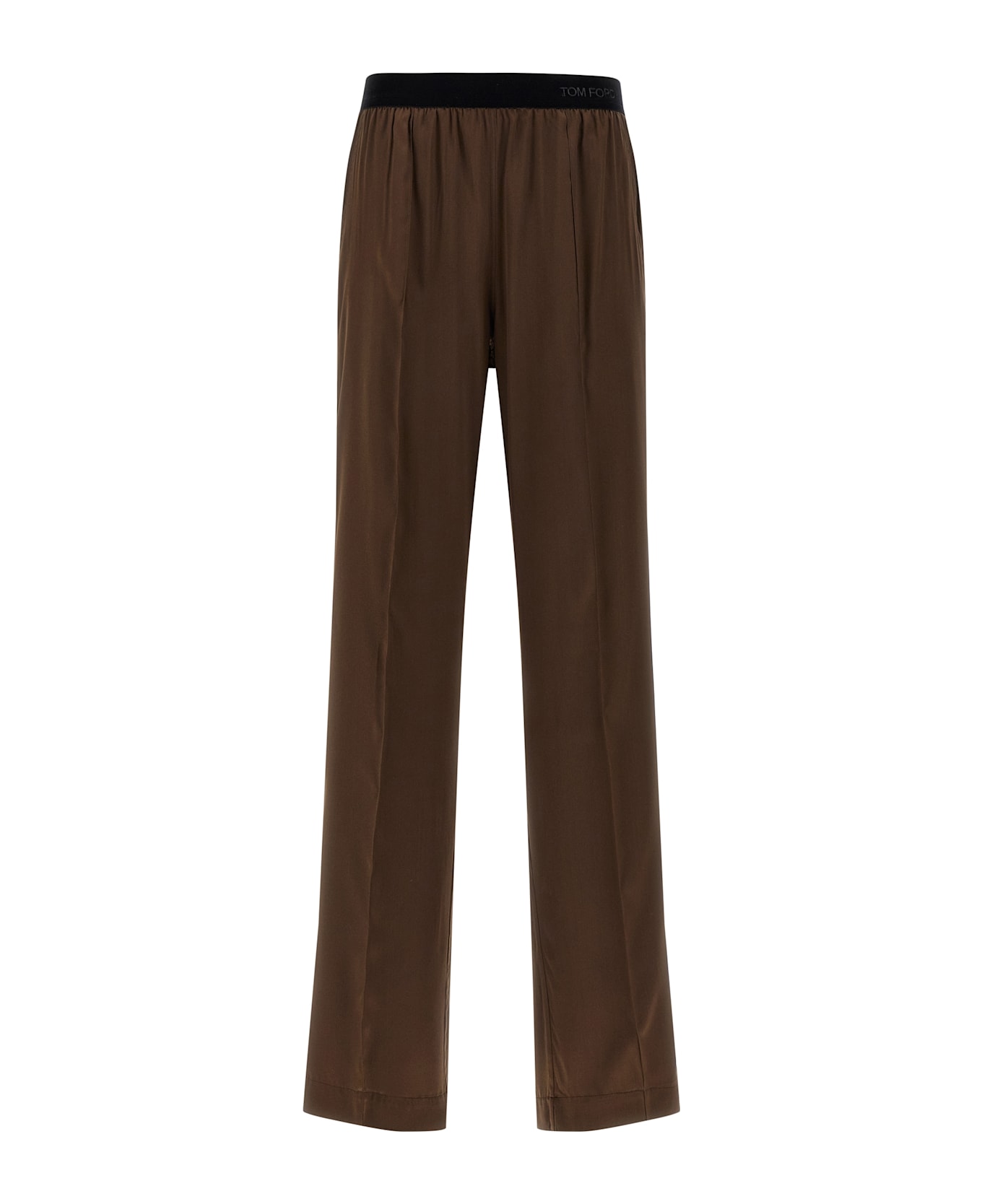Stretch silk satin pants with pajama style, contrast velvet logo elastic band at the waist, pockets, straight leg, medium waist. Composition: 94% silk 6% elastane