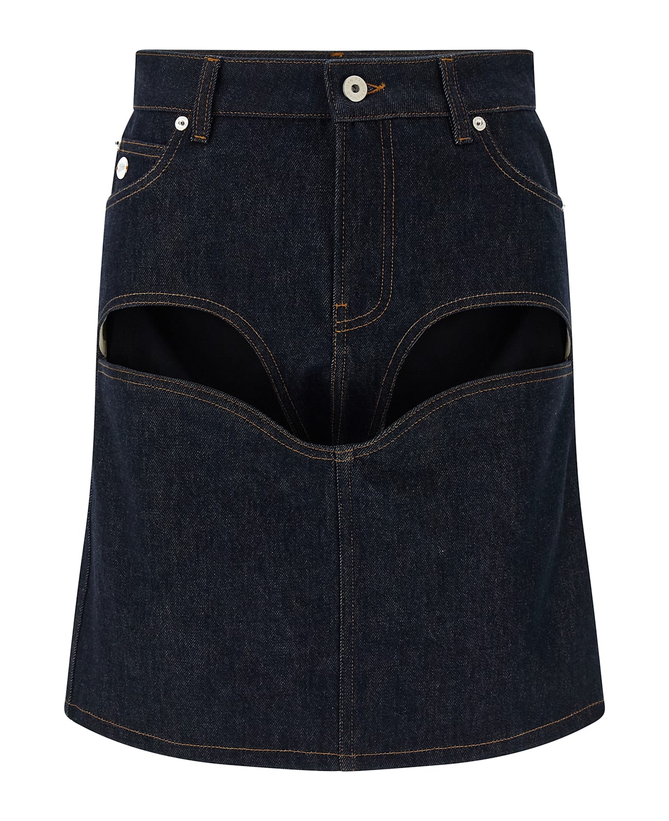 'Denim Mini Skirt With Cuts And Turn Up' cotton denim skirt with contrast stitching, front cut-out detail, integrated culottes, zip and button closure, five pockets, metal plaque with engraved logo, high waist.