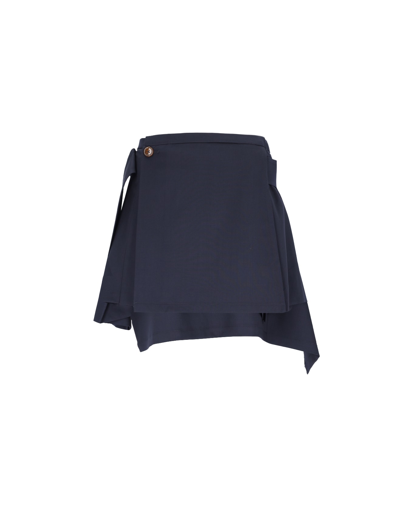 Vivienne Westwood 'Meghan' mini skirt in blue virgin wool with panel kilt design, medium waist, button band closure at the waist, asymmetrical hem. Composition: 100% Virgin Wool