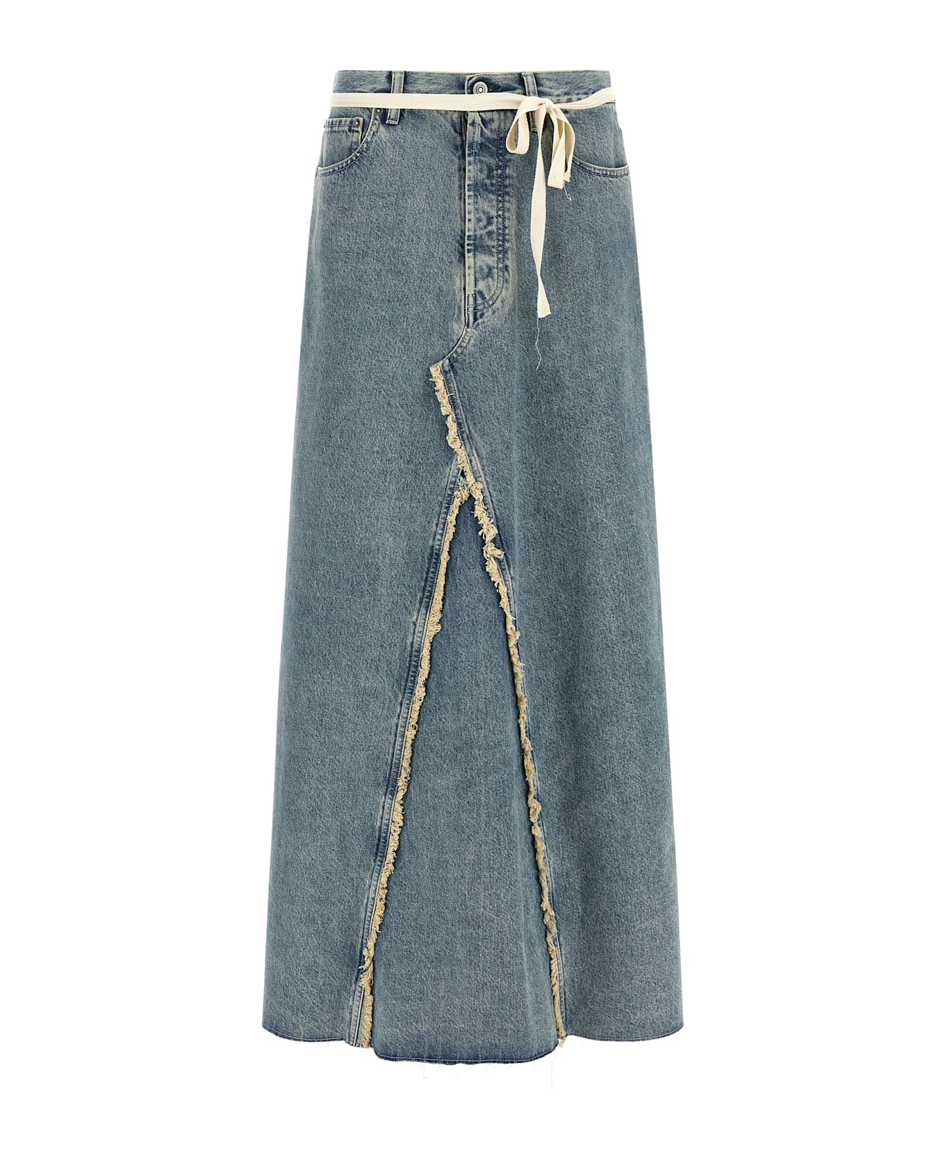 Long skirt in stone-washed cotton denim, raw cut hem with frayed edges, flared silhouette, wallet style with contrast grosgrain lace to tie as desired and open back, pockets, front button closure, five pockets, 'Four Stitches' at the back.