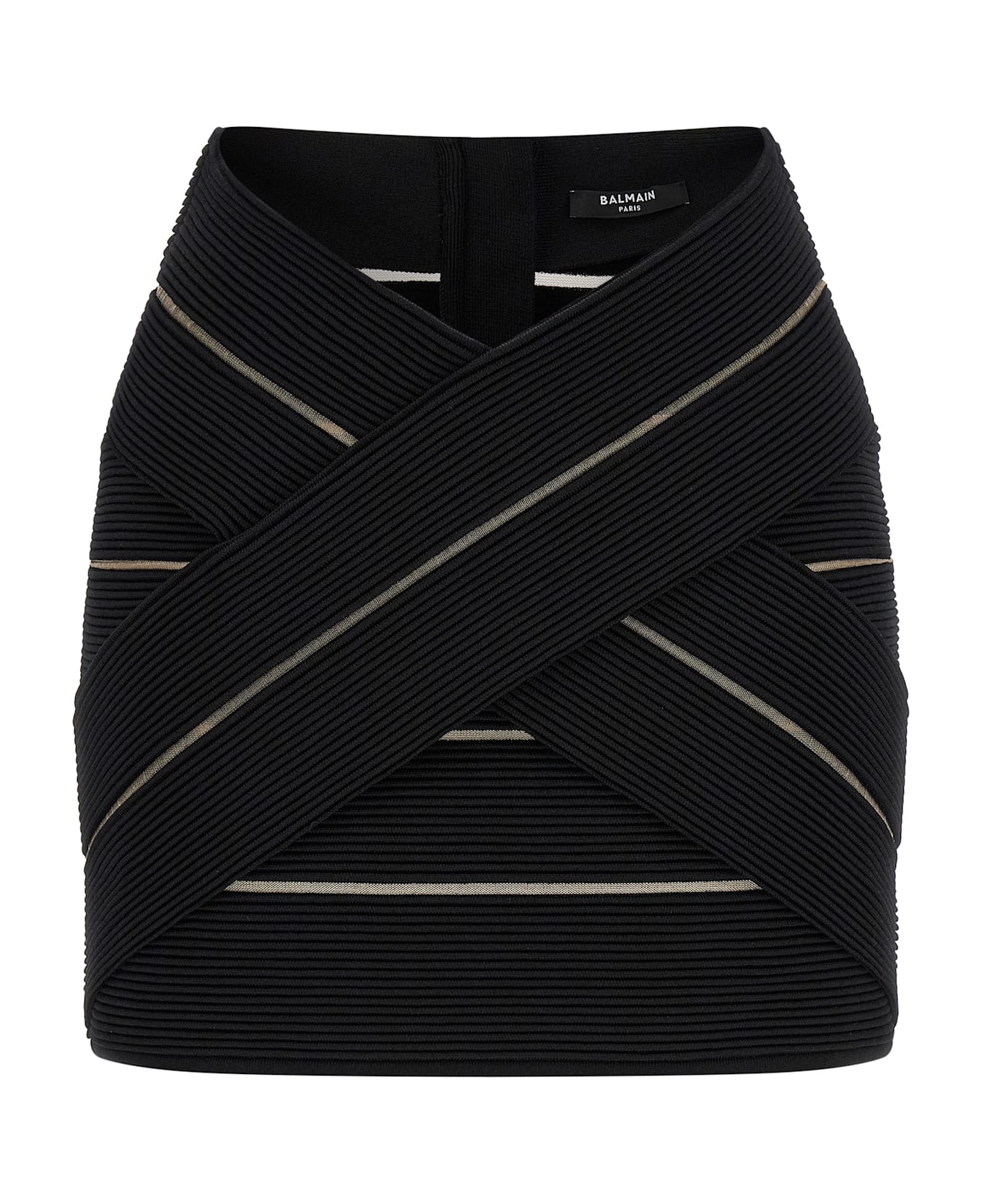 Stretch viscose mini skirt with transparent mesh inserts, V-waist with front X-shaped insert, back zip closure. Composition: 77% viscose 14% polyester 8% polyamide 1% elastane