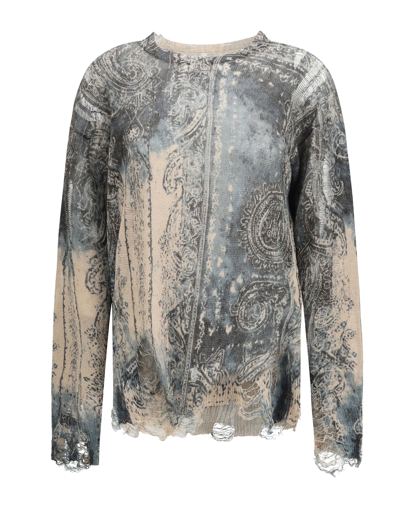 The boyfriend distressed linen knit sweater by r13 reflects the brand s 90s punk-inspired aesthetic. crafted from breathable linen, it features a moody blotch print, boyfriend fit, and a frayed hem, giving the piece a bold and contemporary edge.