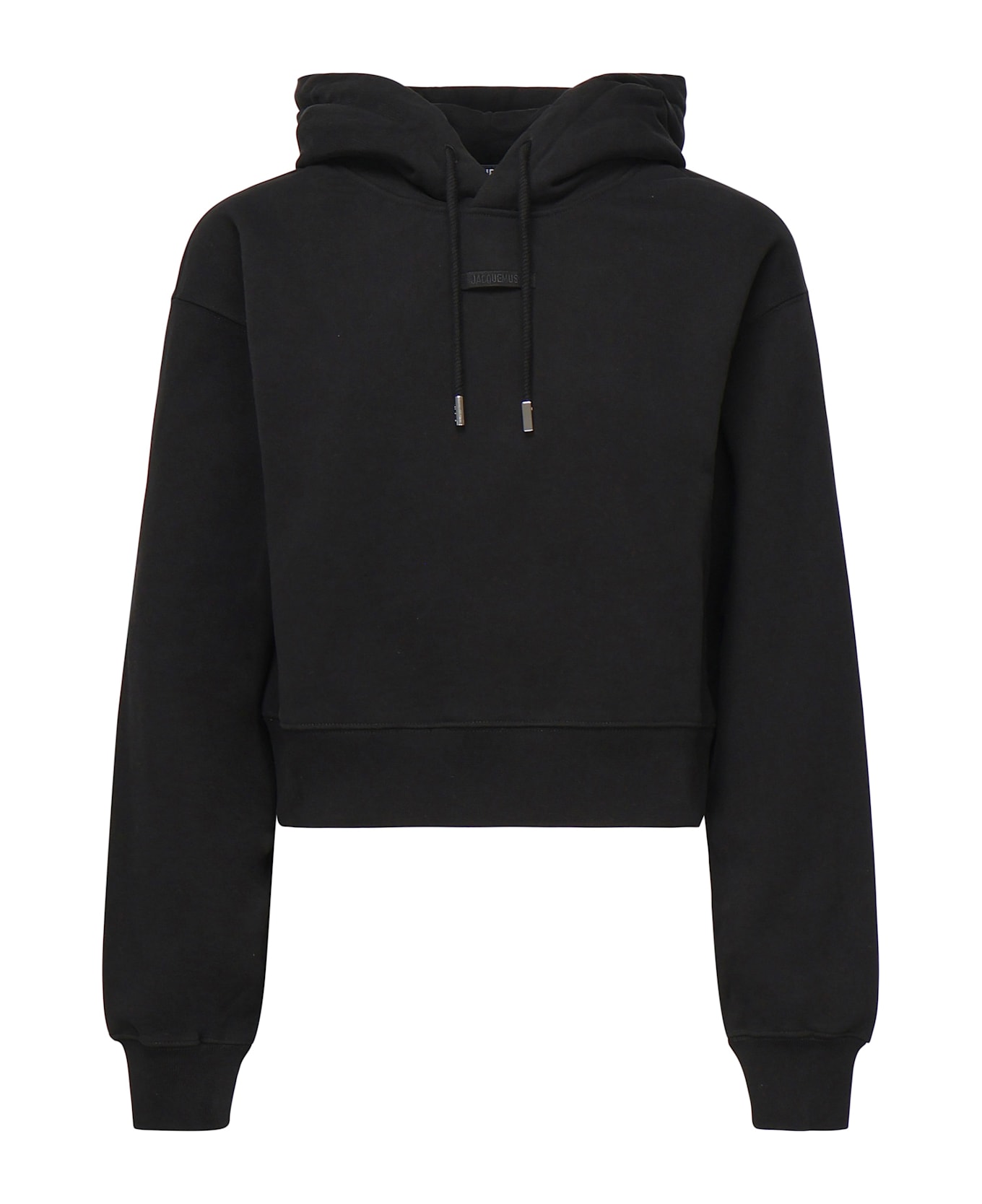 -Made of cotton fleece -Drawstring hood -Long sleeves -Logo embroidery on the chest -Ribbed cuffs and hem -Size shown in photo is XS -Color: Black