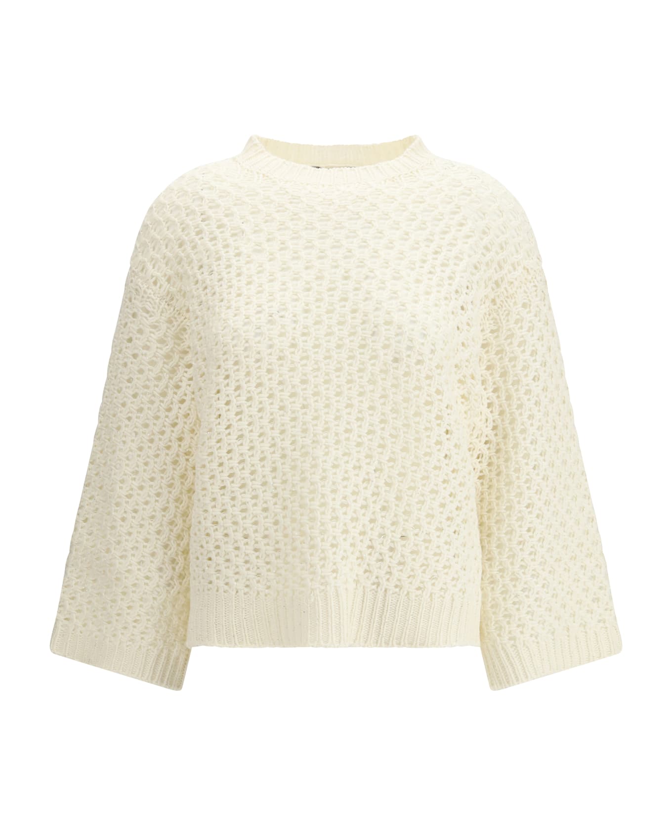 The jumper by fabiana filippi, crafted from platinum yarn with micro sequins, blends softness, luminosity and understated elegance in a contemporary design. the crew neck and honeycomb knit texture enhance the structure of the piece, creating a refined and subtly three-dimensional effect. made entirely in italy through sustainable processes, it adds radiance and femininity while keeping a clean, sophisticated aesthetic.