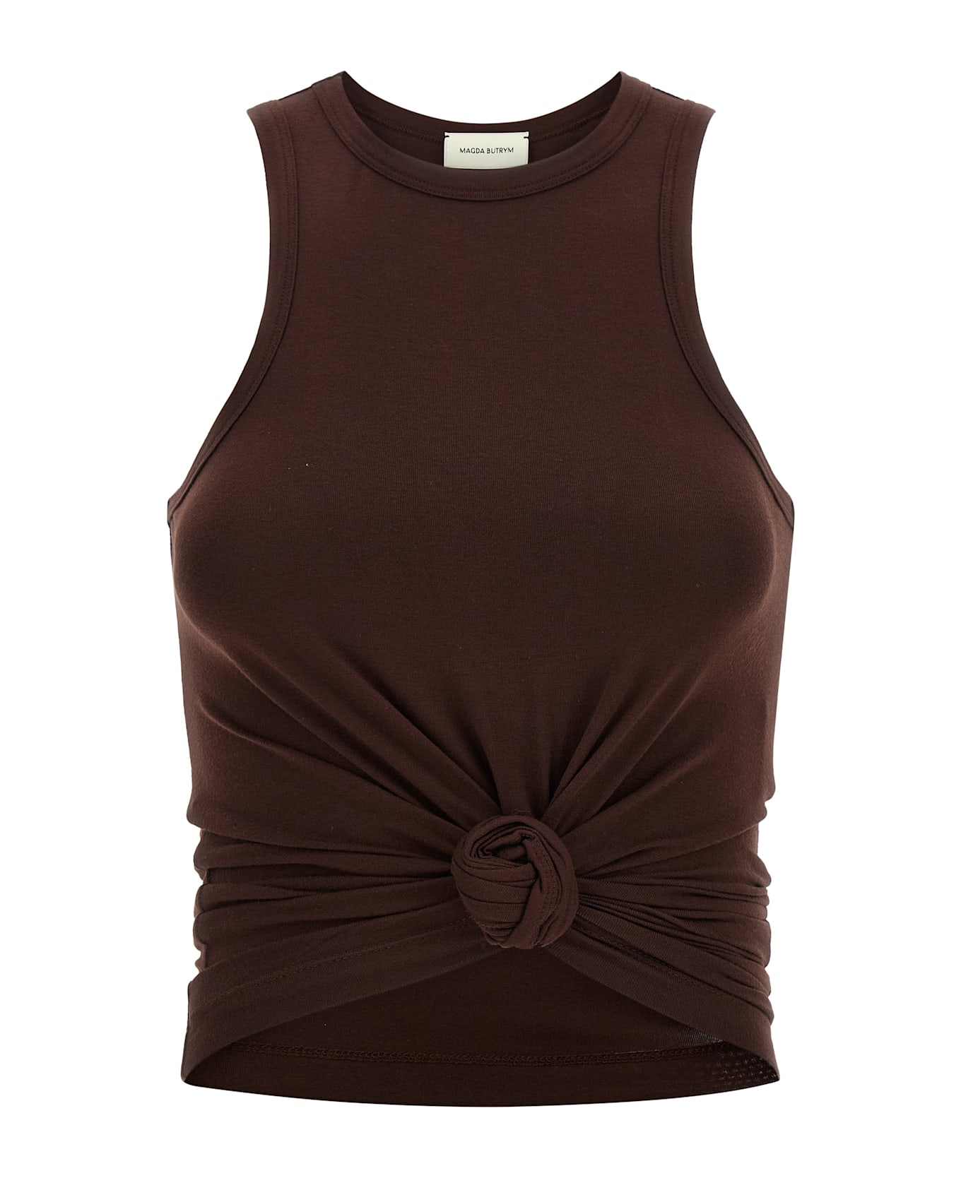 '05' stretch cotton top, sculptural draping created by the intertwined side panels with front ornamental knot, crew neck, asymmetrical hem. Composition: 95% cotton, 5% elastane