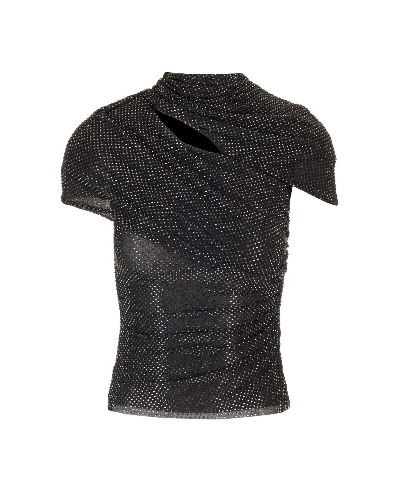 Semi-sheer shiny mesh top by Self-Portrait, with cap sleeves, diagonal draping with cut-out. Composition: MAIN : 95% PES 5%EA LINING : 95% PES 5% EA