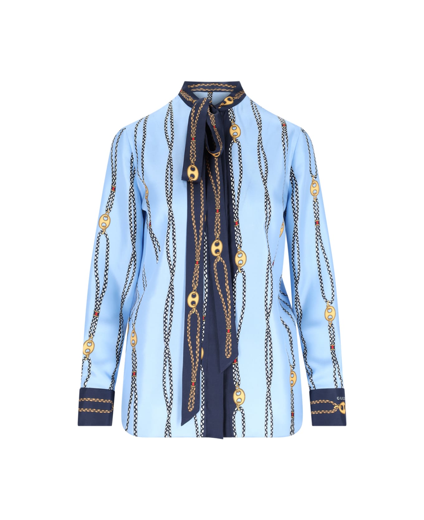 Gucci silk shirt, all-over printed pattern, front bow, long sleeves, button closure, button cuffs, curved hem. Composition: 100% Silk