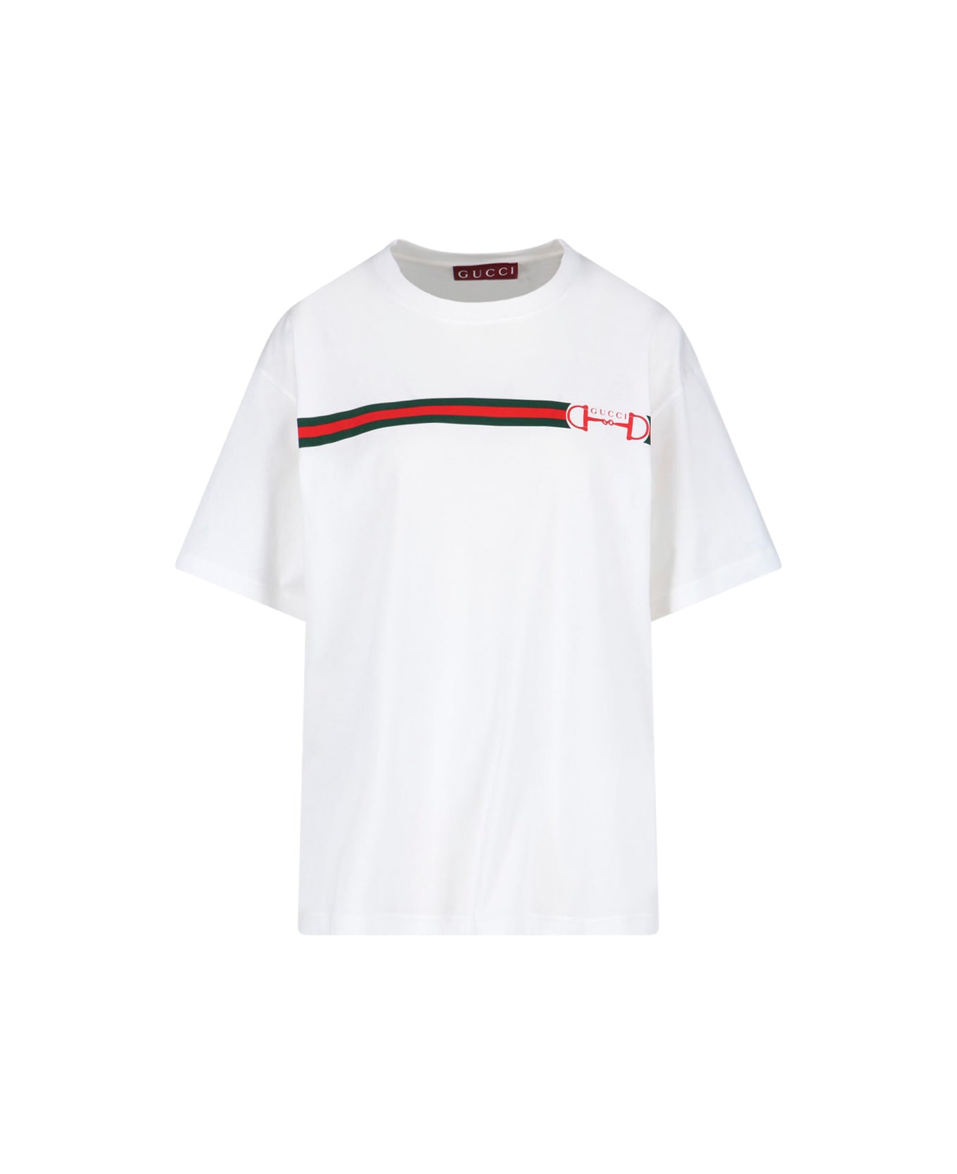 Gucci logo t-shirt in white fabric with crew neck, short sleeves, "horsebit" logo details and two-tone "web" ribbon printed on the front, straight hem. Composition: 100% Textile