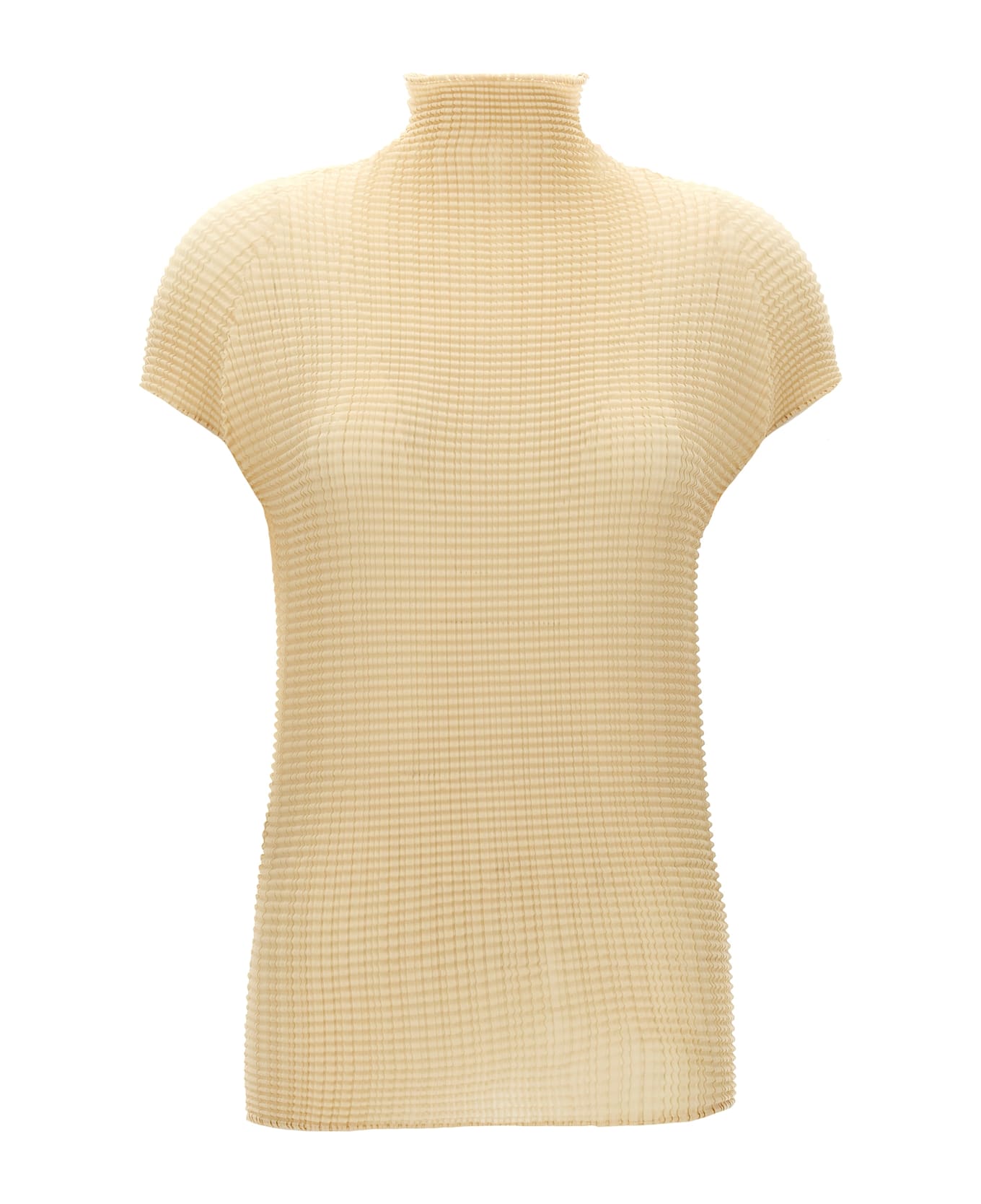 'Wooly Pleats-56' pleated fabric t-shirt with high neck, short sleeves. SUSTAINABLE: Product made from recycled polyester.