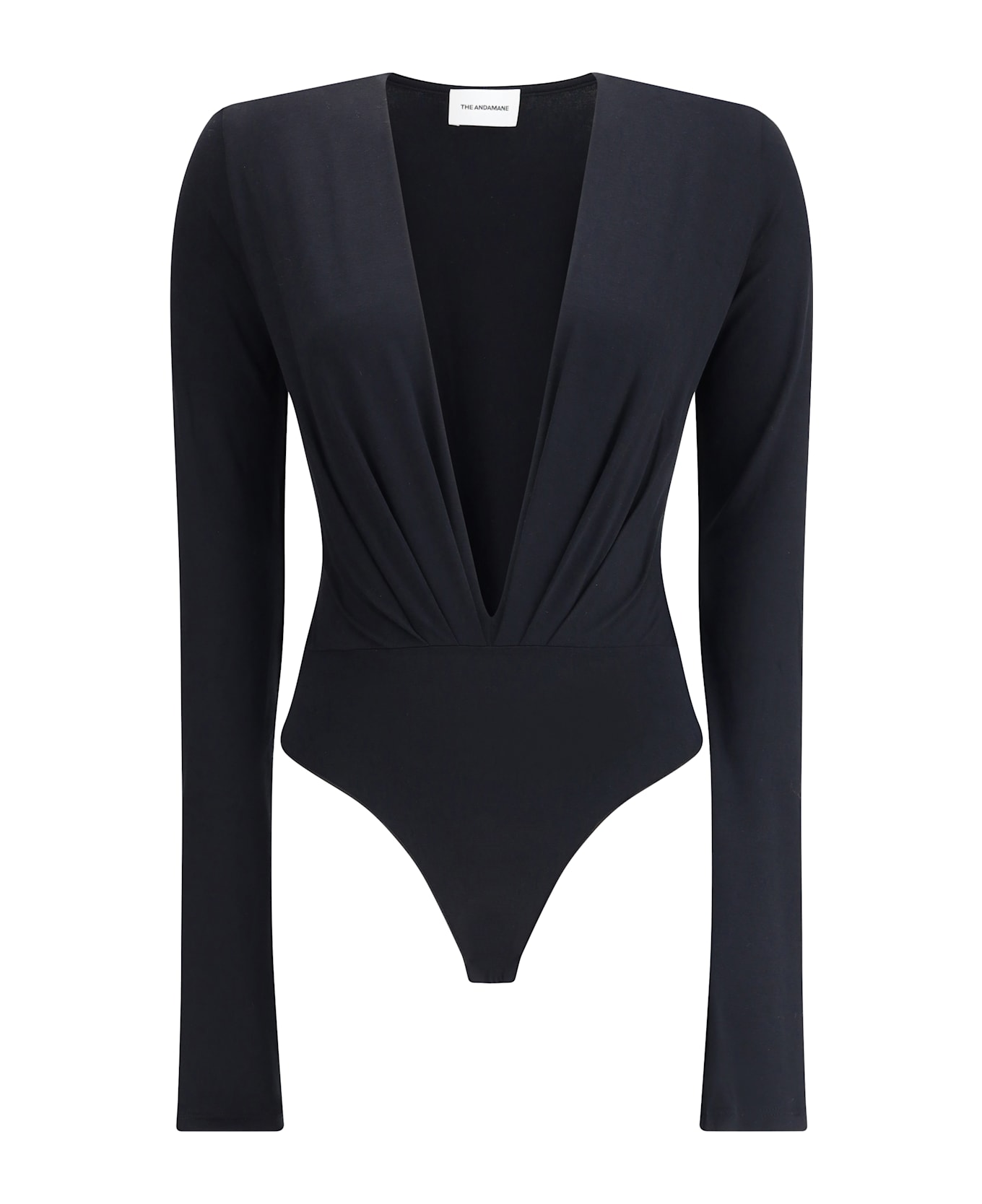 The zelda bodysuit by the andamane is an elegant and feminine piece featuring a draped v-neckline that enhances the silhouette. long sleeves add a sophisticated touch, while the classic button-down bottom closure ensures convenience and comfort.