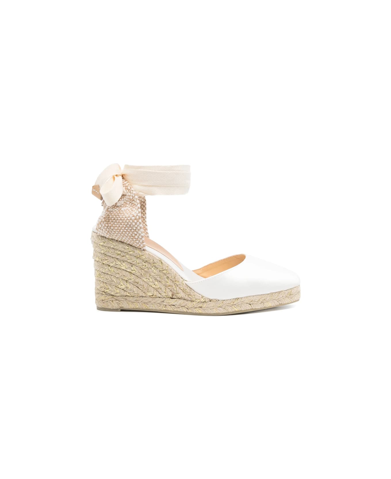 white tie-fastening ankle strap pointed toe high wedge heel branded insole