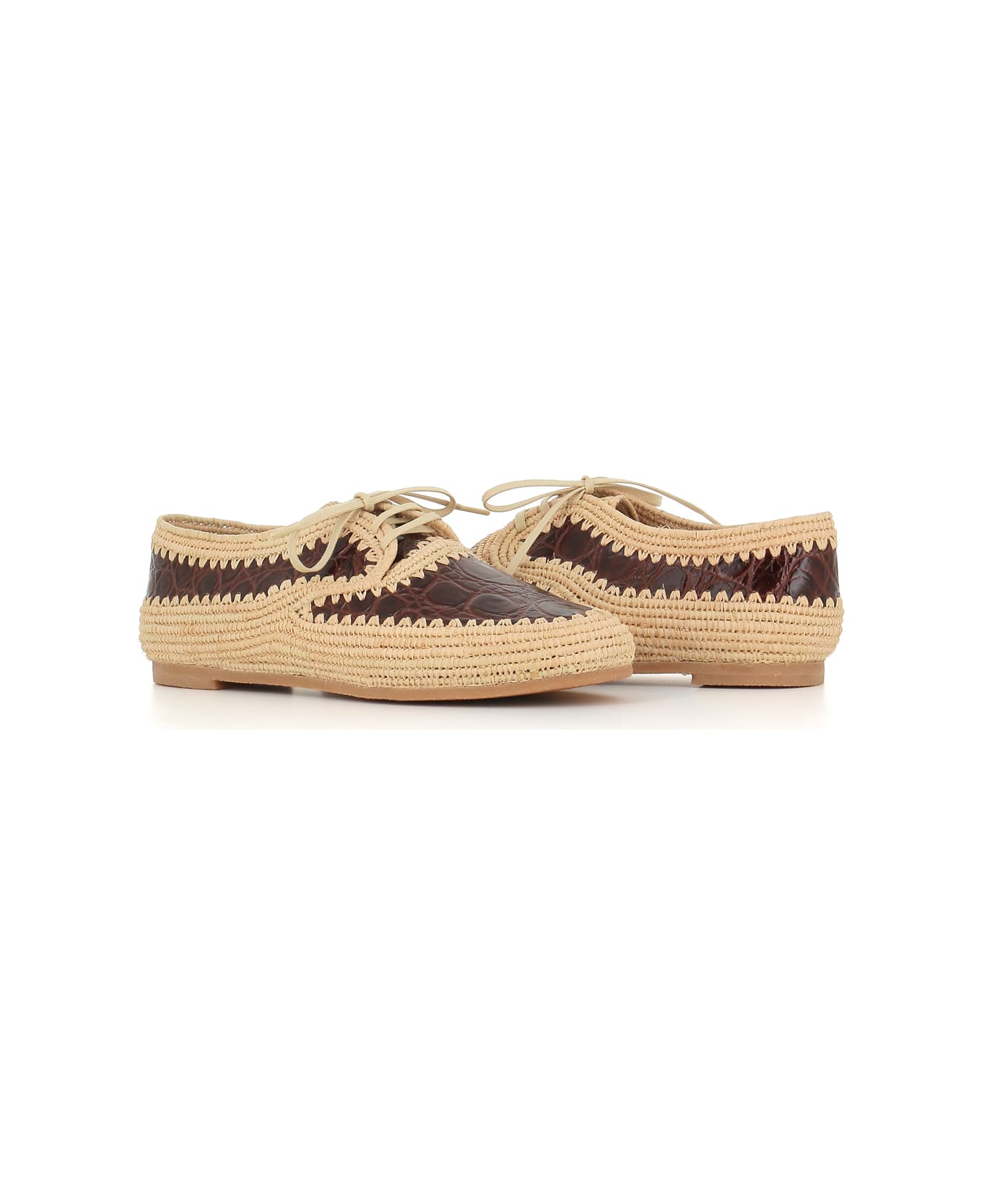 Beige raffia and crocodile-effect printed leather derby from Clergerie. Unlined interior. Rubber sole. Heel: 2 cm