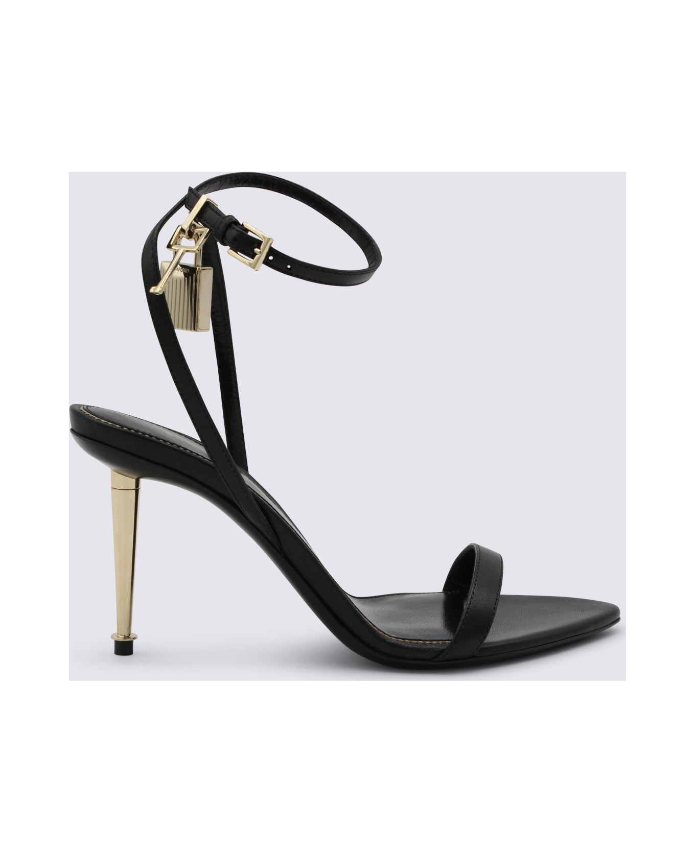 Black leather sandals from Tom Ford featuring open pointed toe, andjustable ankle strap, gold tone stiletto heel and gold tone charms. Composition: _cover Tex/le - Sole, 100% Le