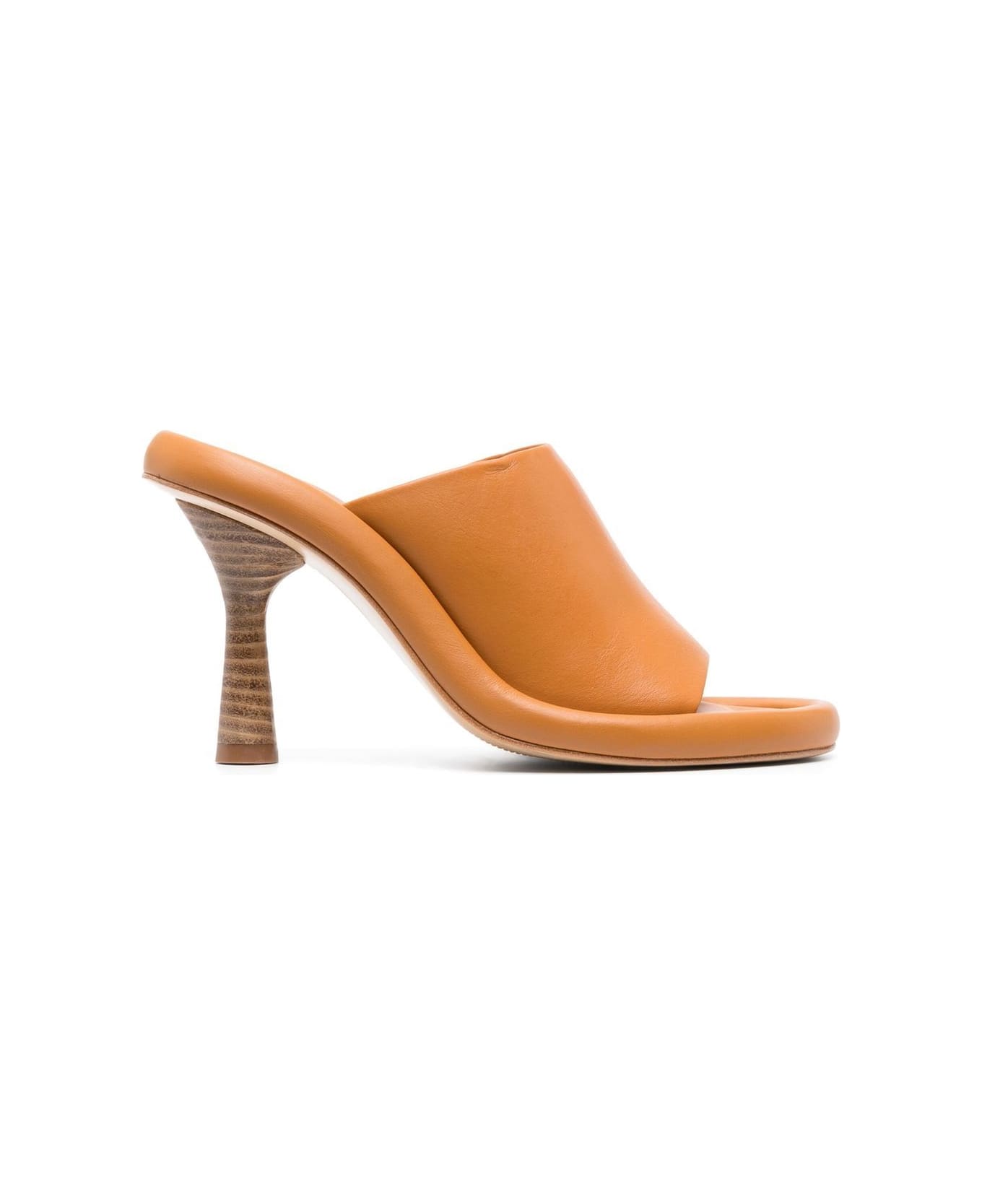 110mm leather open-toe sandals from PALOMA BARCELÓ featuring ochre yellow, calf leather, branded leather insole, open toe, high sculpted heel and slip-on style.