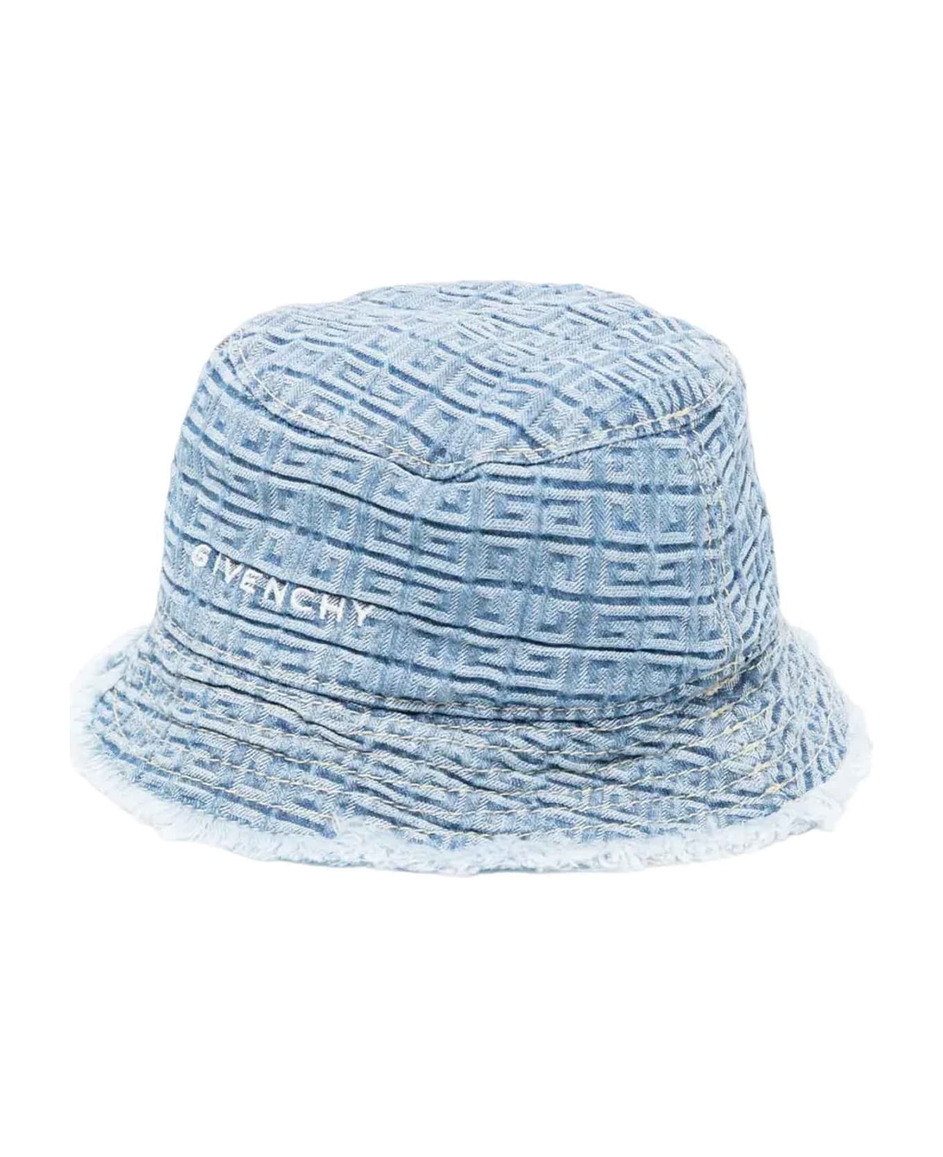 Blue hat baby boy. All-over logo embroidery, front logo embroidery, bucket style, flat crown, wide brim and raw edge hem. 100% Cotton
