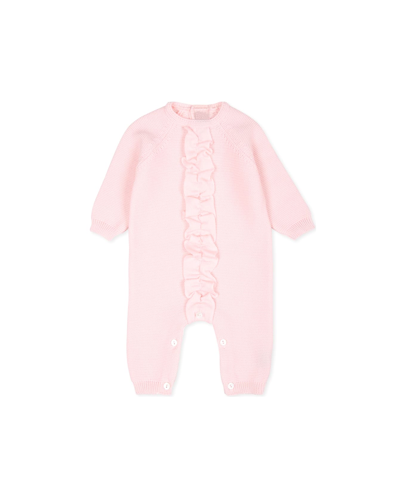 Pink babygrow with crew neck, long sleeves, without feet, and with buttoned fastening on the back and between the legs; it is made from soft wool knit and it is embellished with ruffle on the front.