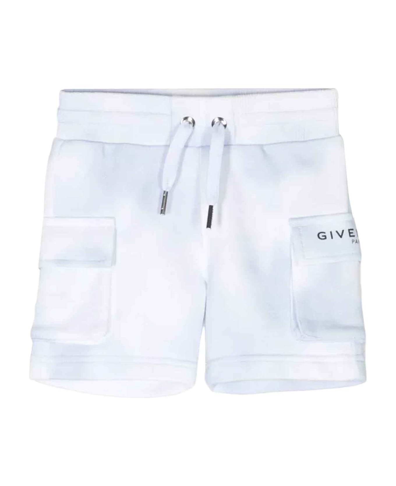 Blue bermuda shorts baby boy. Tie dye pattern, side print with logo, waist with elasticated drawstring, two side pockets with flap and above the knee height. 100% Cotton