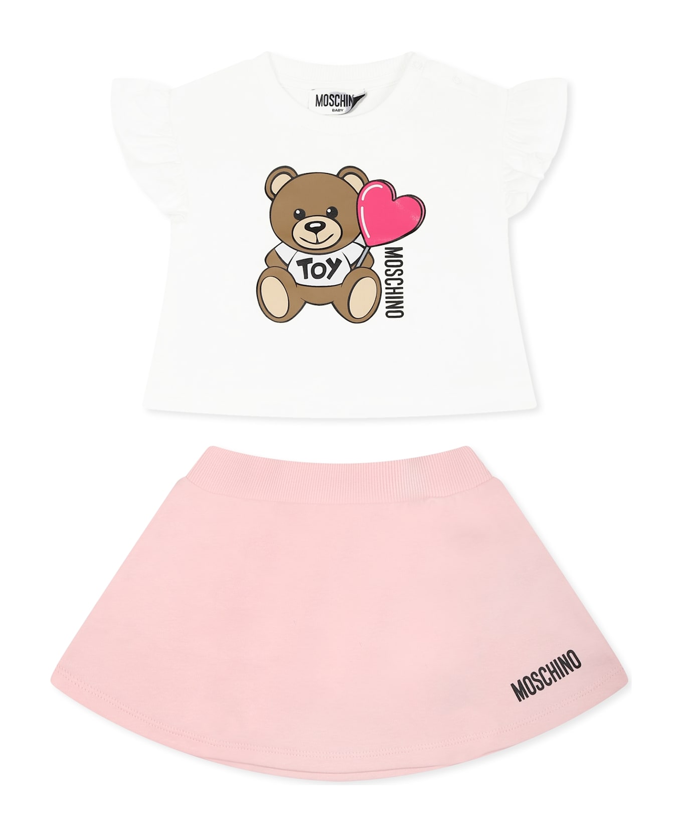 Multicolor suit from the Moschino Kids brand, in a cotton blend, consisting of a t-shirt and skirt. White t-shirt with short sleeves with ruffles, ribbed crew neck and snap button closure on the shoulder. It is embellished with Teddy Bear, heart and logo printed on the front. Pink skirt with elastic waist; decorated with logo on the front.