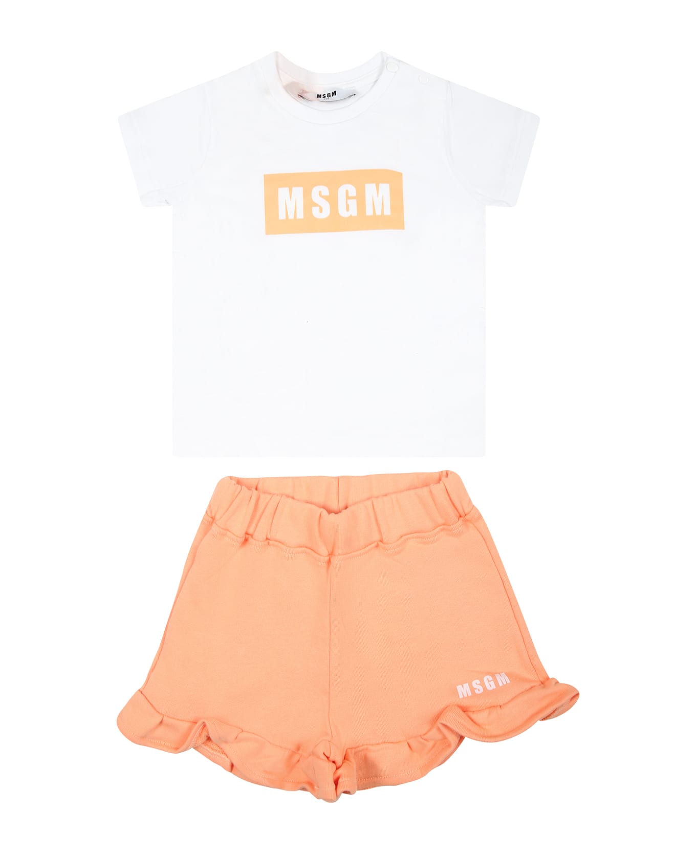 Orange cotton suit composed of t-shirt and shorts. White short-sleeved T-shirt, ribbed crew-neck, snap button closure on the shoulder. It is embellished with contrasting logo on the front. Orange shorts with elasticated waist and ruffles at the bottom. They are embellished with logo on the front.