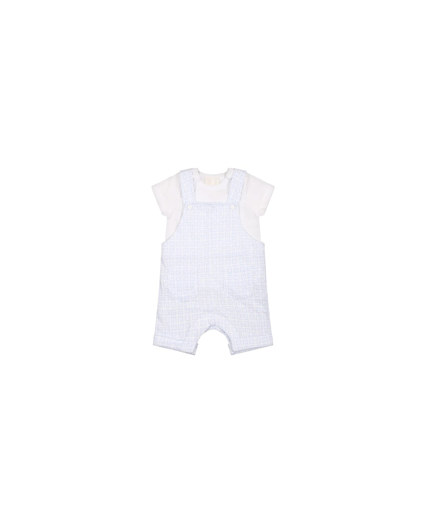 logo-print dungaree set from Givenchy Kids featuring light blue, cotton, logo print to the front, short sleeves, straight hem, signature 4G motif, all-over logo print, square neck, thin shoulder straps, two front patch pockets and above-knee length. Your purchase will arrive with a gift box..