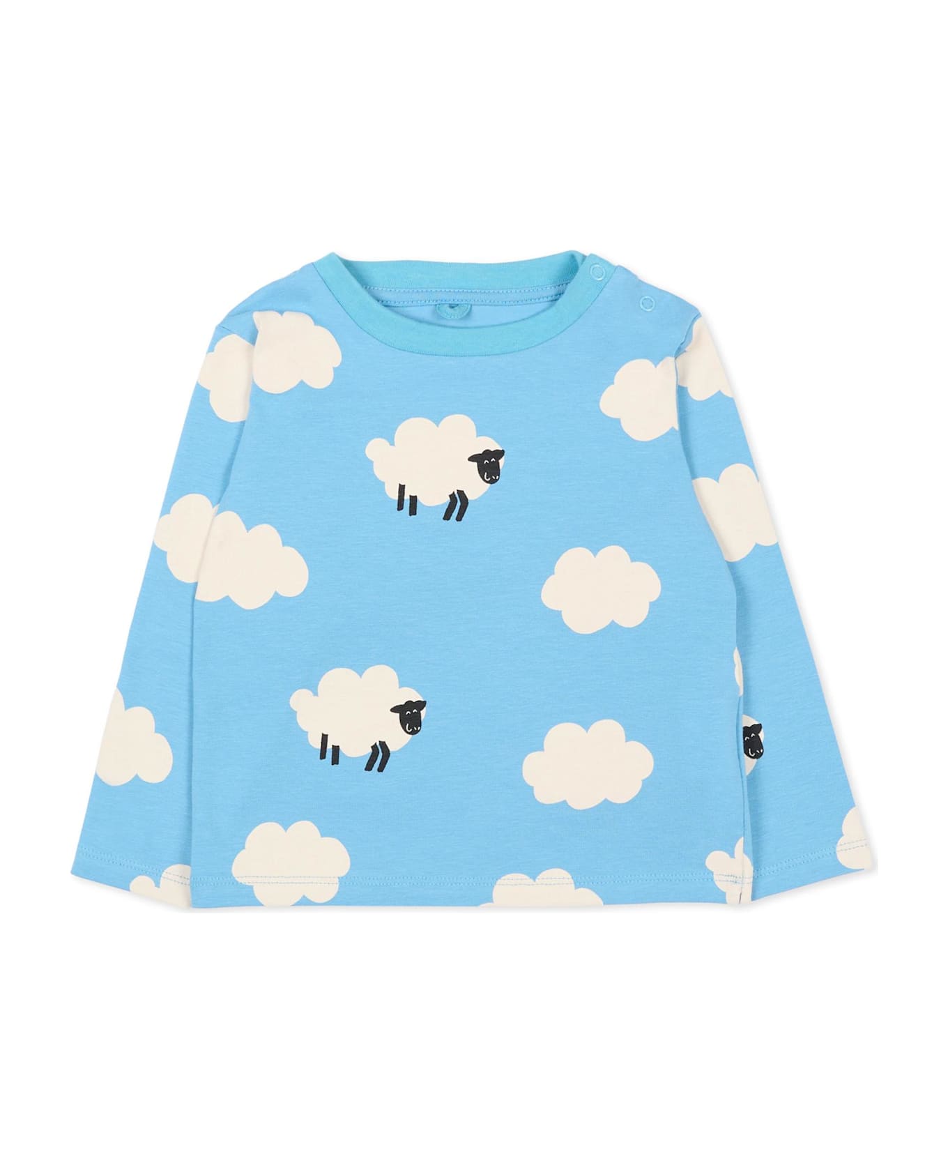 Light blue organic cotton blend T-shirt with long sleeves, a crew neck, and snap button closure at the shoulder. It is embellished with an all-over sheep and cloud print.
