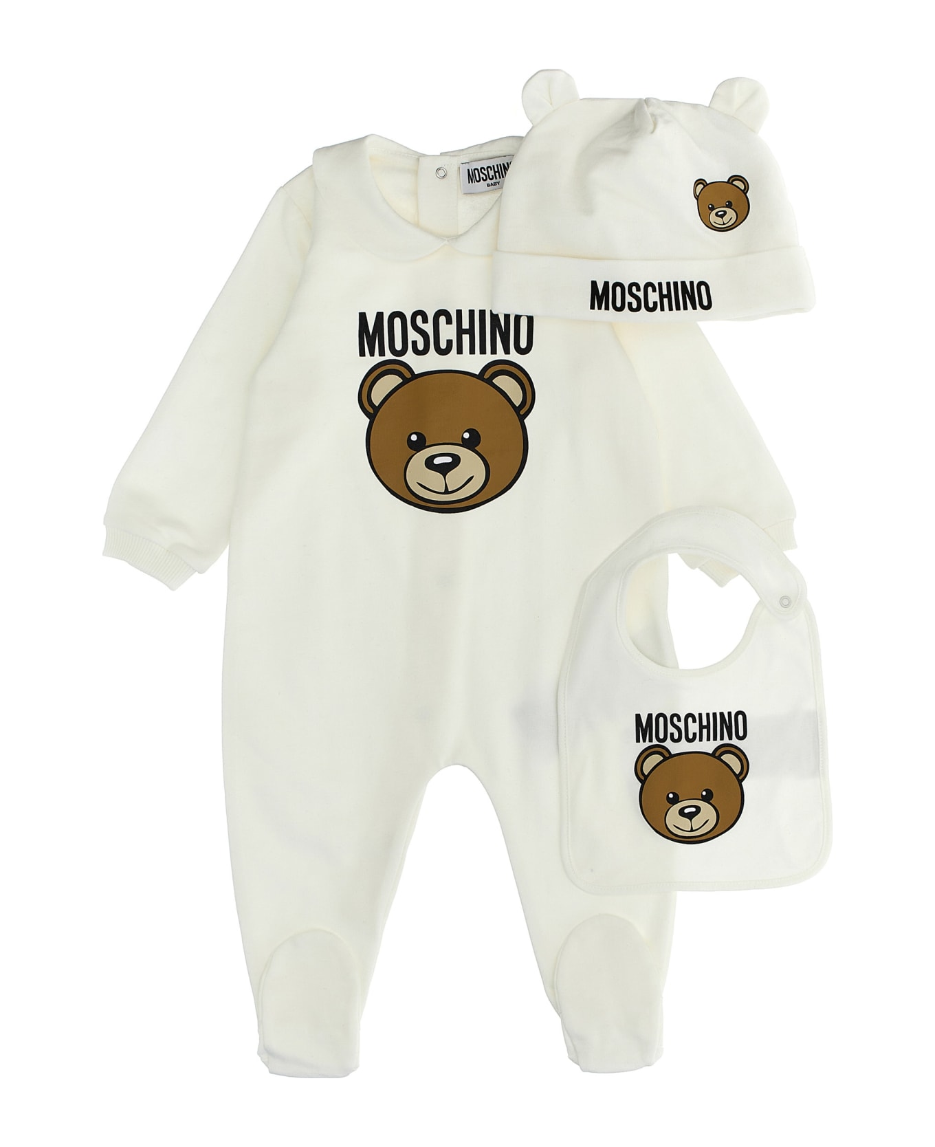 Cotton baby set with front 'Moschino Teddy Bear' print consisting of jumpsuit, cap and bib. Composition: 100% cotton