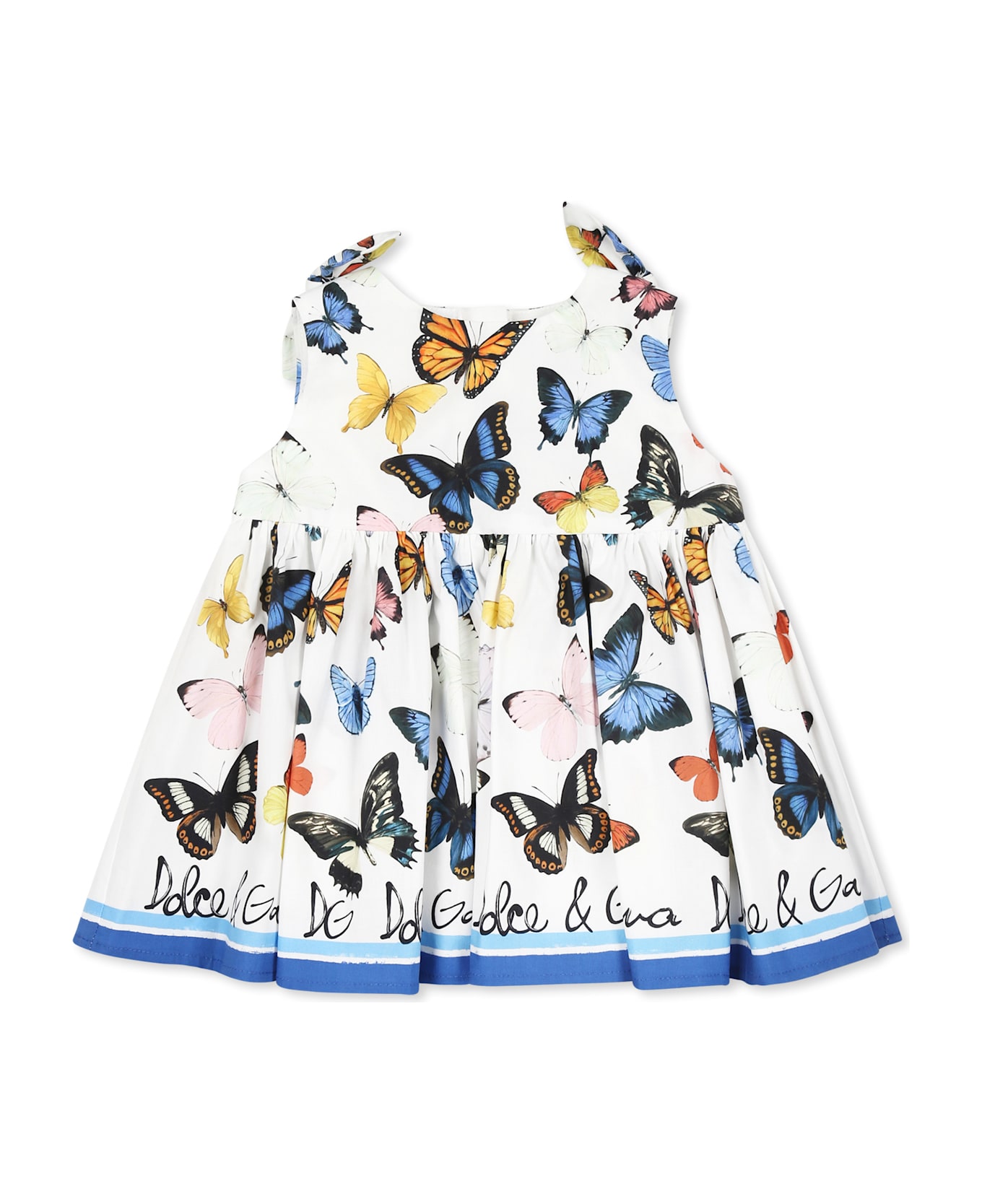 White dress from the luxury Italian brand Dolce & Gabbana Kids, made of cotton, sleeveless, with round neckline, bows applied on the shoulders and a zip closure on the back. It is embellished with sall over butterflies and a logo on the bottom.