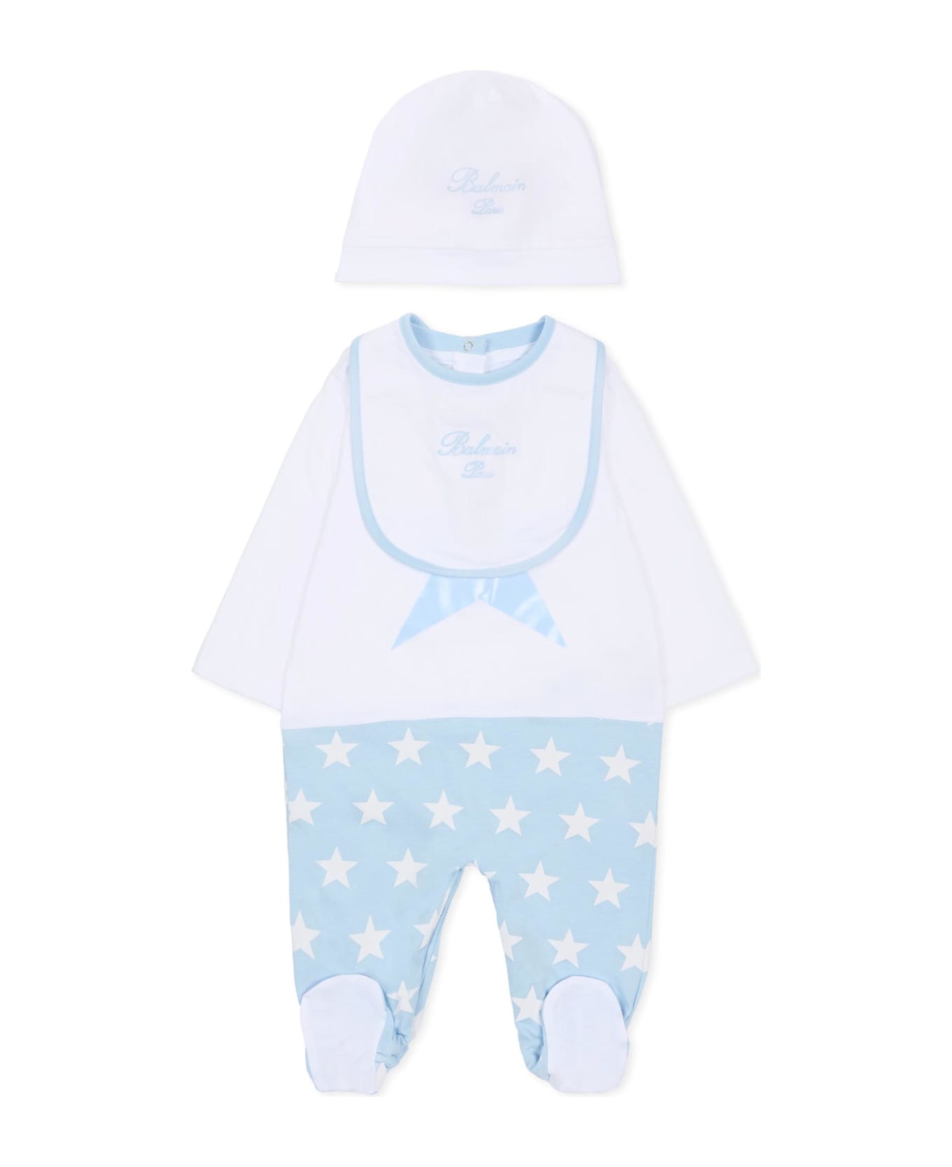White cotton set composed of a romper suit, bib and hat. White romper suit with long sleeves, round neck, feet and press stud fastening at the back and between the legs; embellished with a light blue star with white logo on the top and black bottom with stars. White hat embellished with a light blue logo. White bib with black trim and snap fastener closure at the back; embellished with a light blue logo on the front.