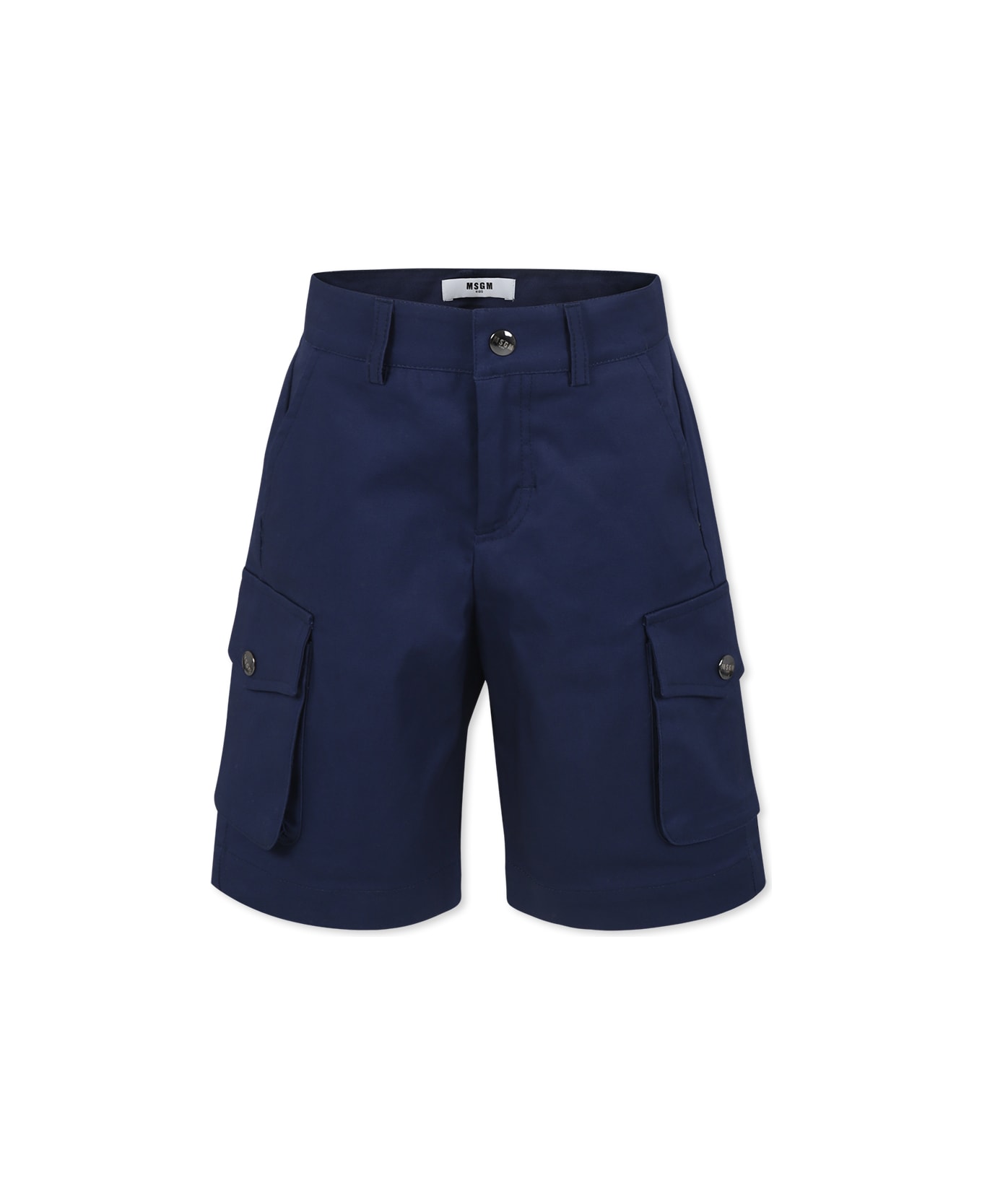 Blue shorts with belt loops, front zip and snap button closure, adjustable waist thanks to internal elastic with buttons, side welt pockets, back pocket and cargo pockets on the sides. They are embellished with a logo patch on the side.