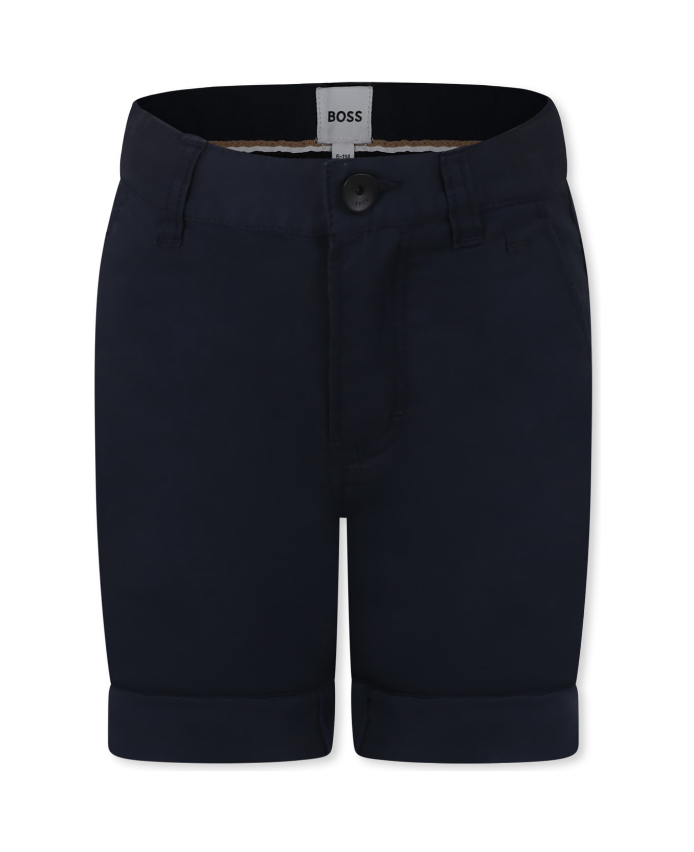 Blue shorts with belt loops, front zip and button fastening, adjustable waist with internal elastic with buttons, side pockets, back pockets and cuffed hems. They are embellished with black, white and beige striped details.