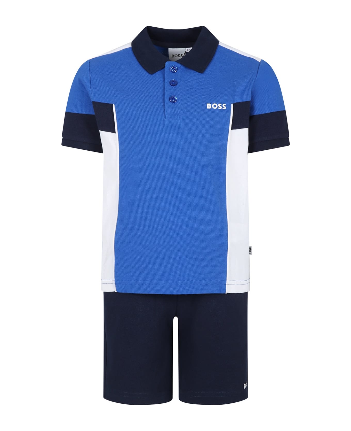 Blue cotton suit composed of polo shirt and shorts. Cotton piqué polo shirt, with short sleeves, collar and front button closure. It is embellished with logo printed on the chest. Shorts with elasticated waist, drawstring and side pockets. They are embellished with logo on the bottom.