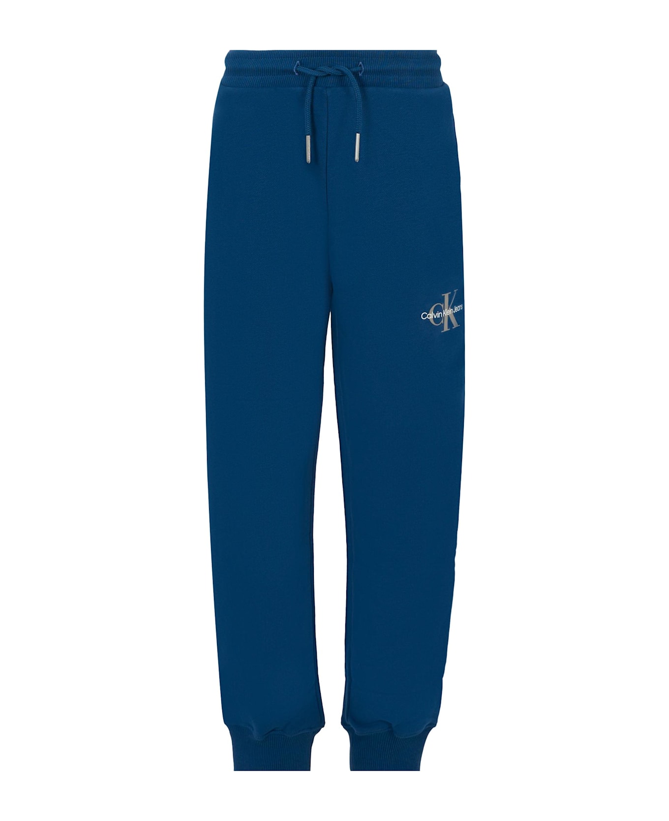 Blue trousers in slightly fleeced cotton, with elasticated waist, drawstring, side pockets, patch pocket on the back and ribbed ankles. They are embellished with a logo print on one leg.