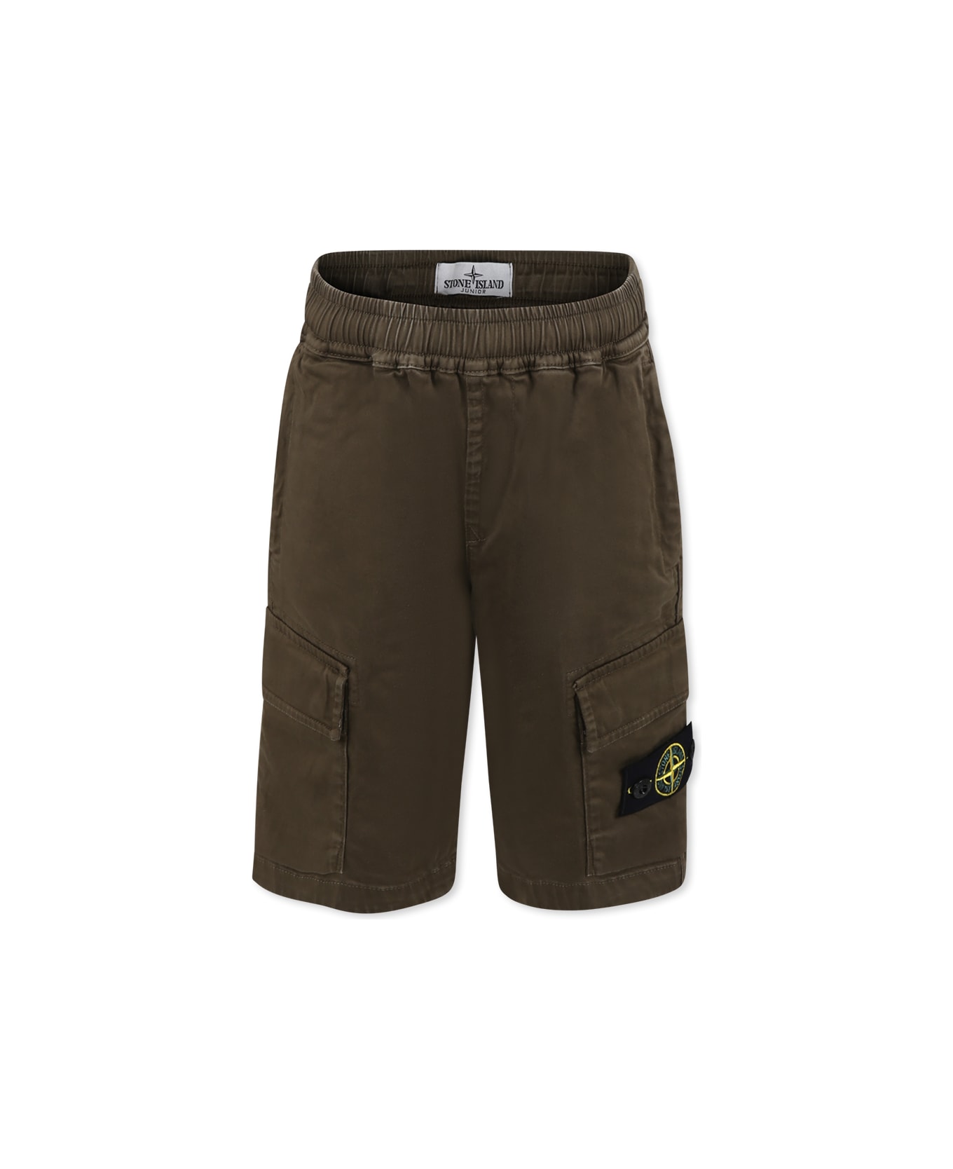 Green shorts in organic cotton blend, with elasticated waist, internal drawstring, side zip pockets, back pocket and cargo pockets on the sides. They are embellished with iconic compass patches on one side