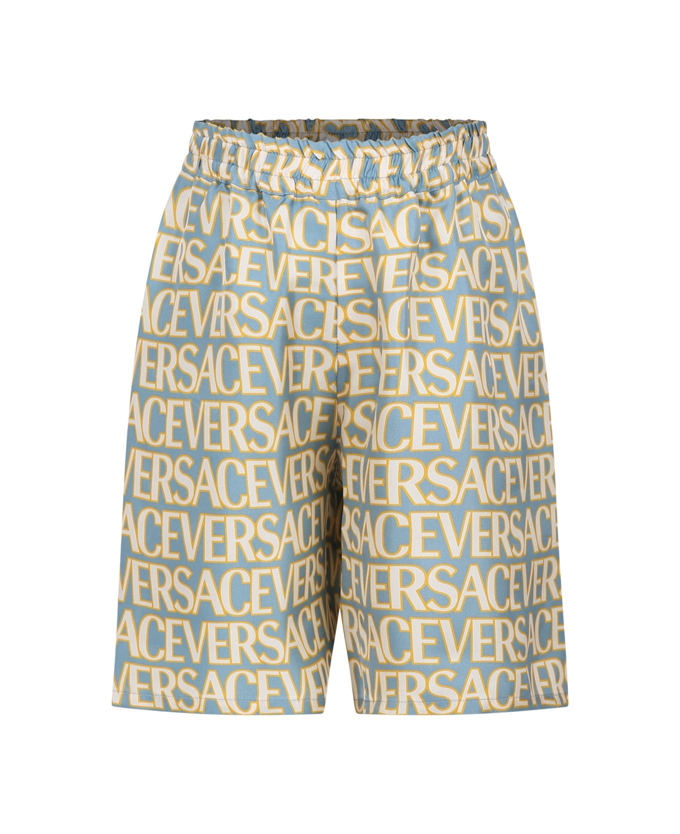 Light blue silk shorts, with elastic waistband and back pocket. They are embellished with all-over iconic logo.