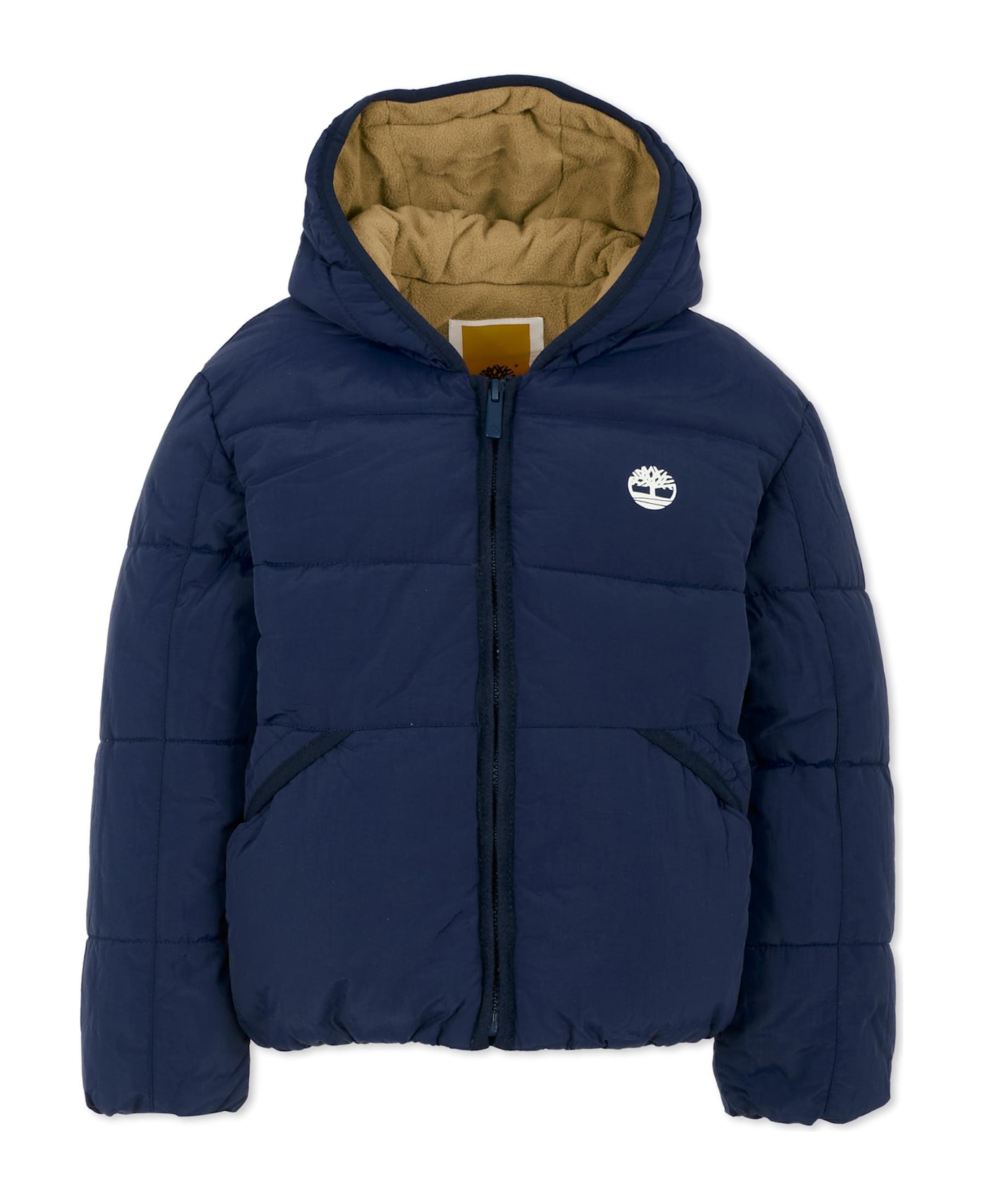 Heavyweight blue quilted down jacket with long sleeves, a hood, a front zip fastening, side pockets, and elasticated cuffs and hem. Made from recycled materials. It is embellished with a logo on the chest.
