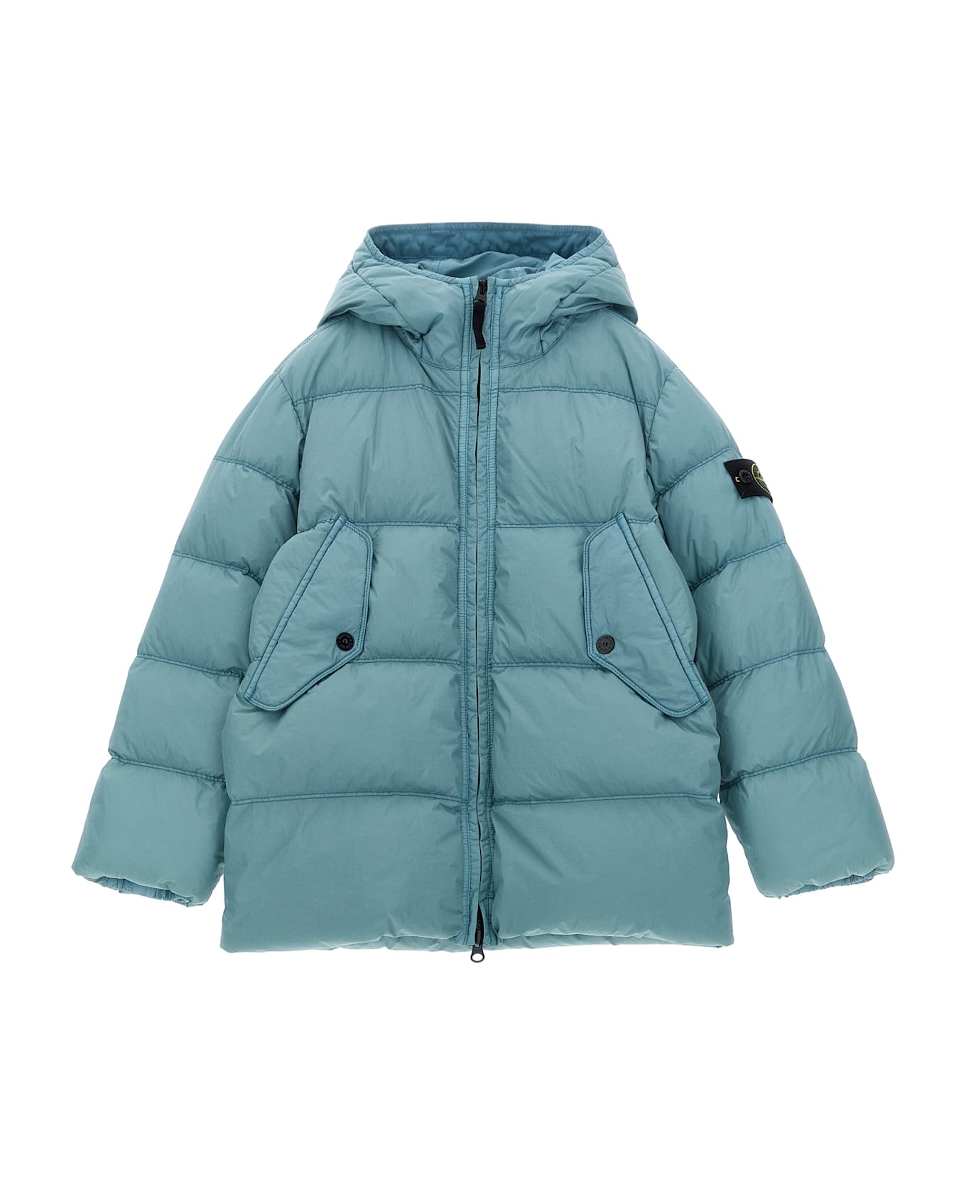 KIDS Dyed down jacket in quilted synthetic fabric with wrinkled goose down padding, hood, high neck, front zip closure, pockets, long sleeves with elastic cuffs and logo badge. SUSTAINABLE: This product is made with recycled nylon.