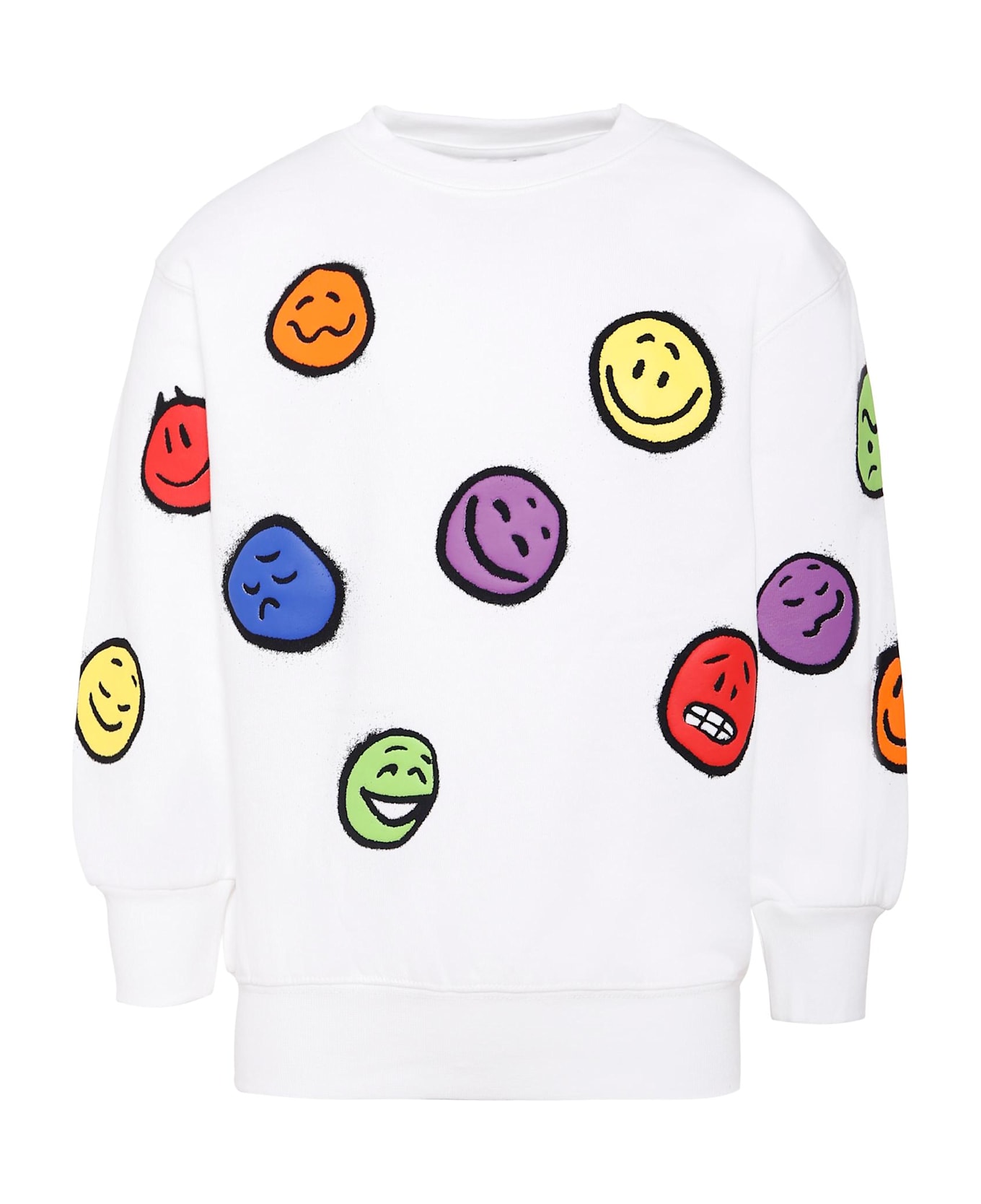White sweatshirt in GOTS certified organic cotton fleece, long sleeves, with ribbed crew neck, cuffs and hem. It is embellished with multi-coloured smiles all-over, on the sleeves and on the front.