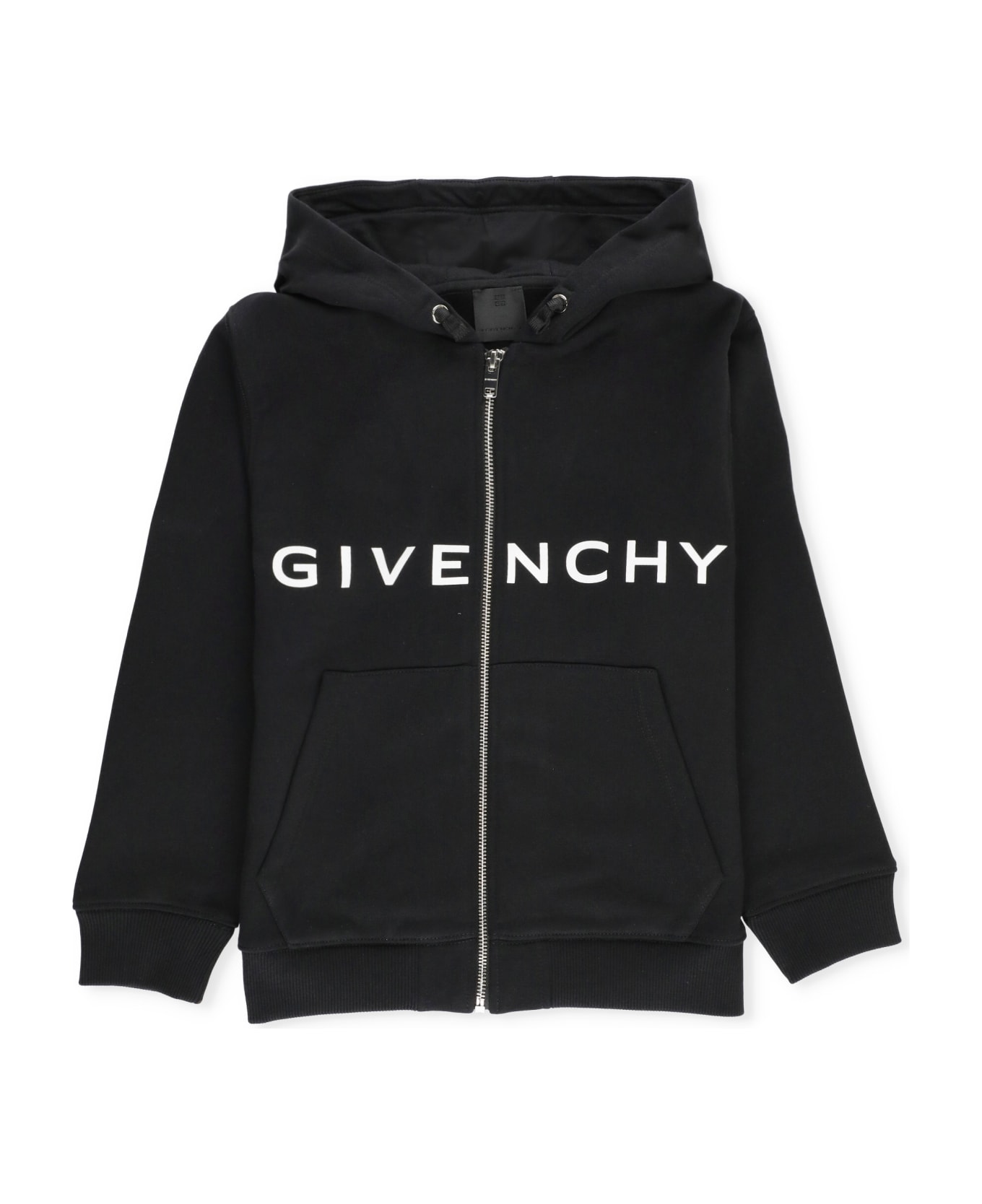 - Black Givenchy Junior cotton sweatshirt for boy - Hood with drawstrings - Long sleeves - Elastic ribbed trims - Two front slit pockets - Front contrasting color printed logo - Front zip fastening - Rear contrasting color print