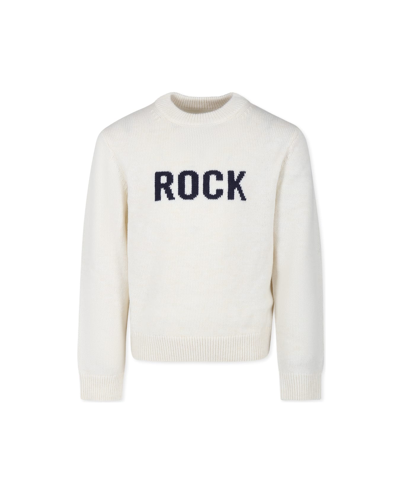 Ivory wool blend sweater, with long sleeves, ribbed crew neck, cuffs and hem. It is embellished with intarsia writing "Rock" in black on the front and pointelle logo embroideried on the bottom.