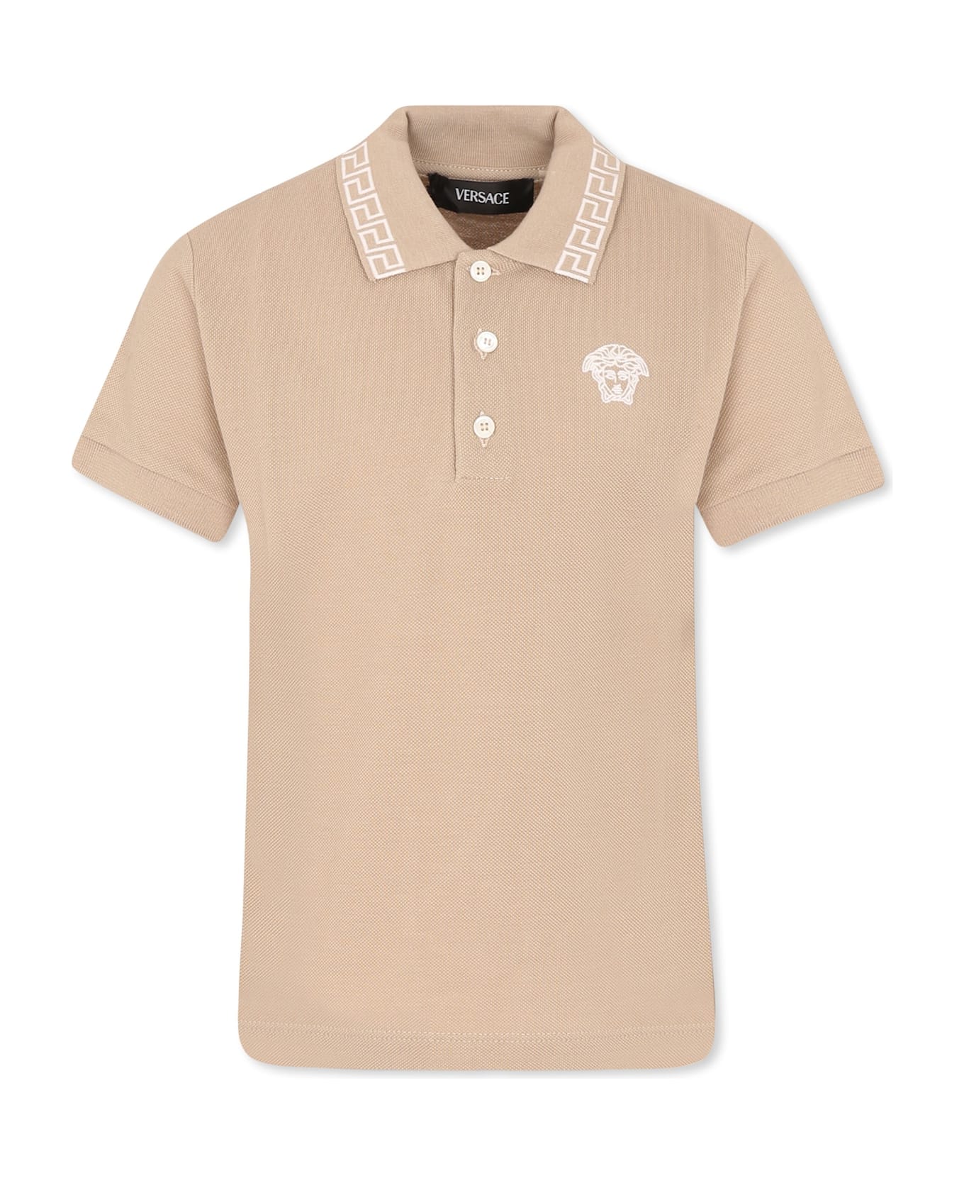Beige polo shirt from the Italian luxury brand Versace, in cotton pique, short sleeves, with a pointed collar with the iconic Greek key and a front button fastening. It is embellished with an embroidered Medusa on the chest.