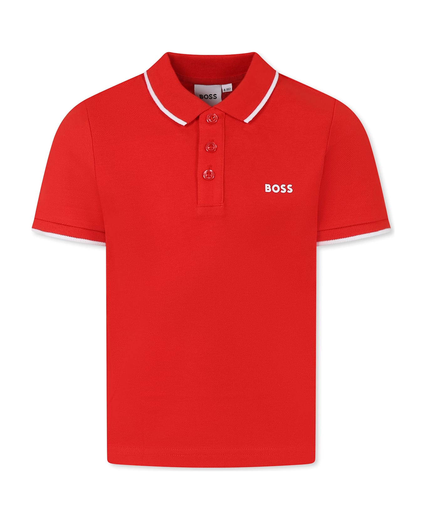Red cotton pique polo shirt, with short sleeves, pointed collar, front button fastening. It is embellished with logo on the chest.