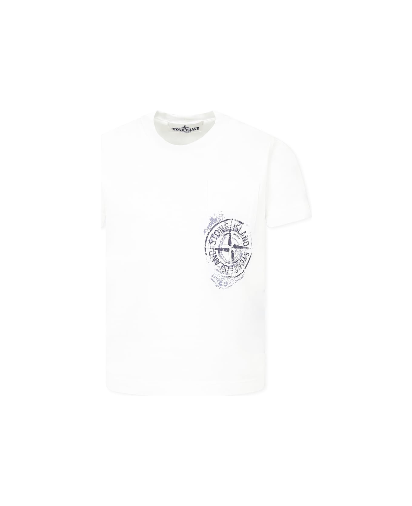 White cotton t-shirt with short sleeves, ribbed crew neck and chest patch pocket. It is embellished with iconic compass printed on the chest and logo on the back.