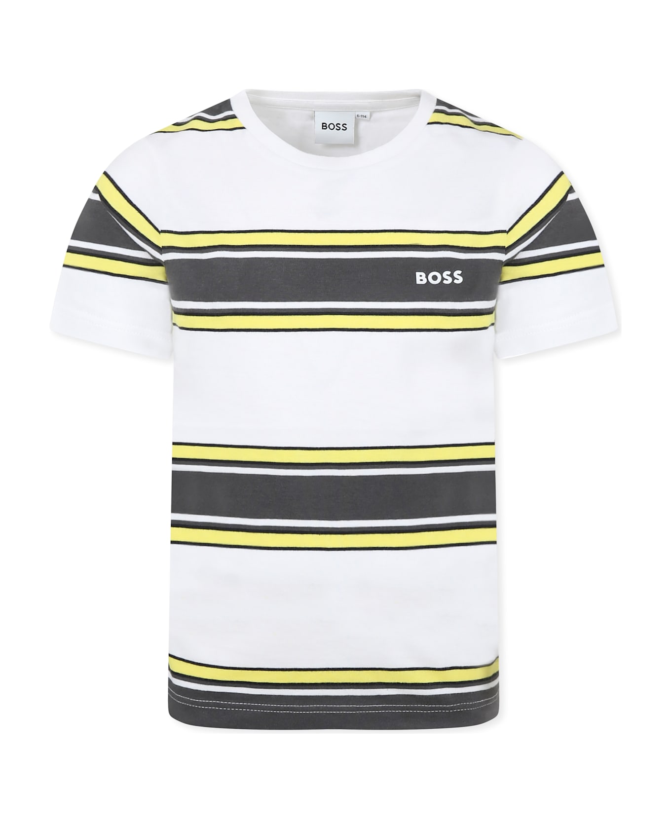 White t-shirt with yellow and green stripes, made of cotton, with short sleeves and ribbed crew neck. It is embellished with logo on the chest.