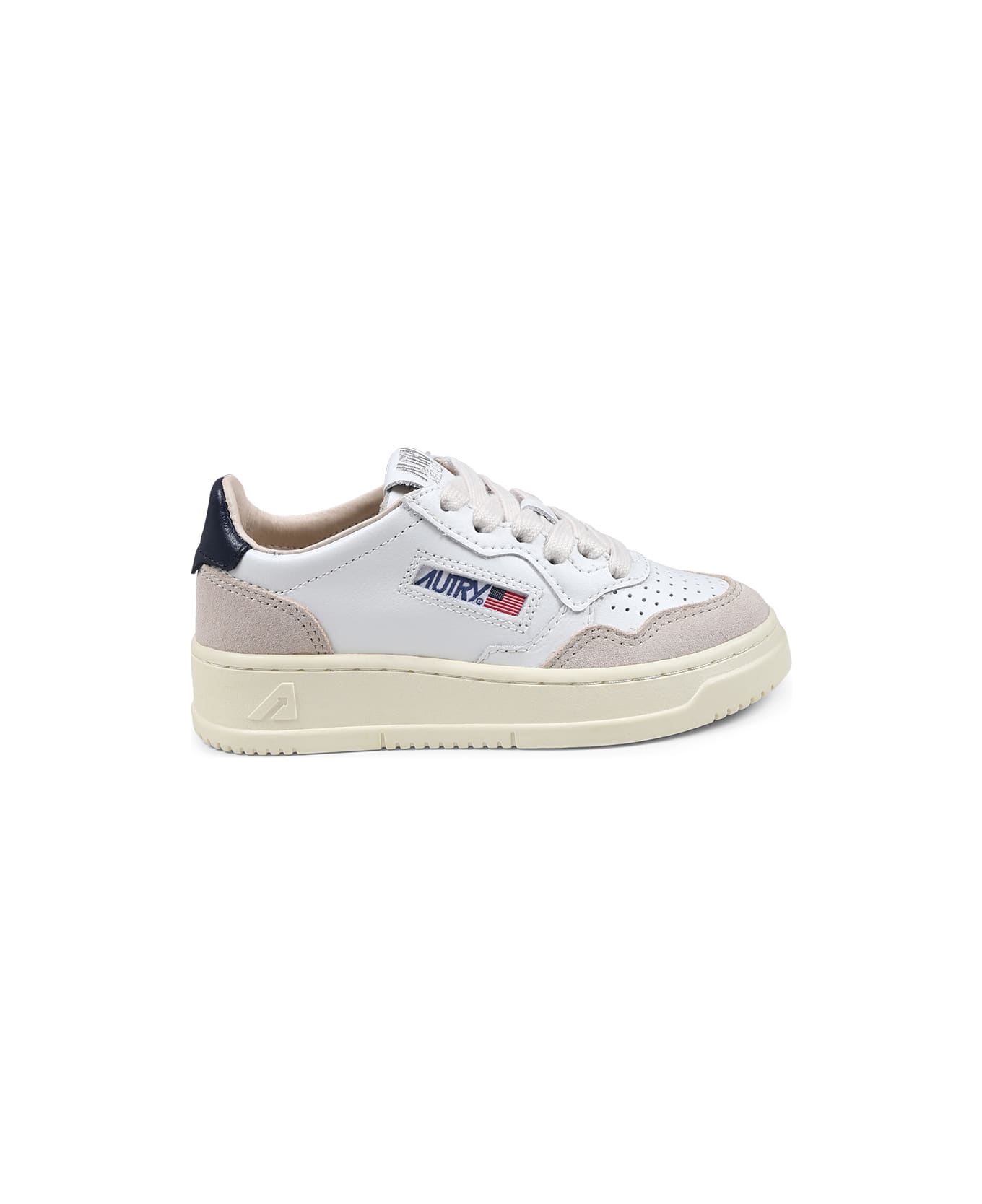 White leather sneakers with rubber sole, lace-up closure, perforated toe for breathability, padded collar and beige suede details. They are embellished with a side logo.