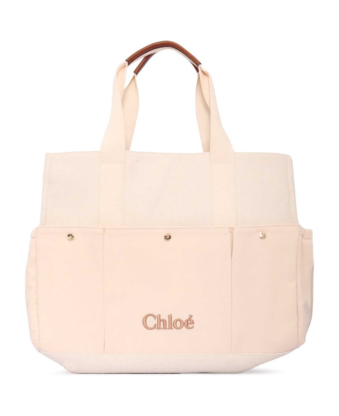 Bi-fabric changing bag in wool blend broadcloth (refer to composition) and tonal cotton canvas, cow leather strap and details (chrome tanning), front and sides multipockets with snaps, cotton twill lining, embroidered Chlo logo on front. Dimensions: 33x41x15cm. Strap length: 83cm. Sold with a zipped branded pouch. Composition: 100% POLYESTER FABRIC 2 100% LEATHER FABRIC 3 100% COTTON FABRIC 4 58% WOOL 42% VISCOSE