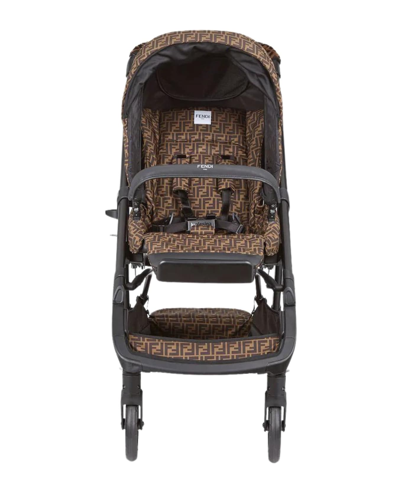 Reversible flame-retardant stroller suitable from birth to up to 22kg, in all-over FF logo fabric and sheepskin frame handle. Generous seat that can recline in 7 positions, including fully into a sleeping position, full-cover hood with SPF 50+ protection and net ventilation insert. The pushchair is fully removable and washable