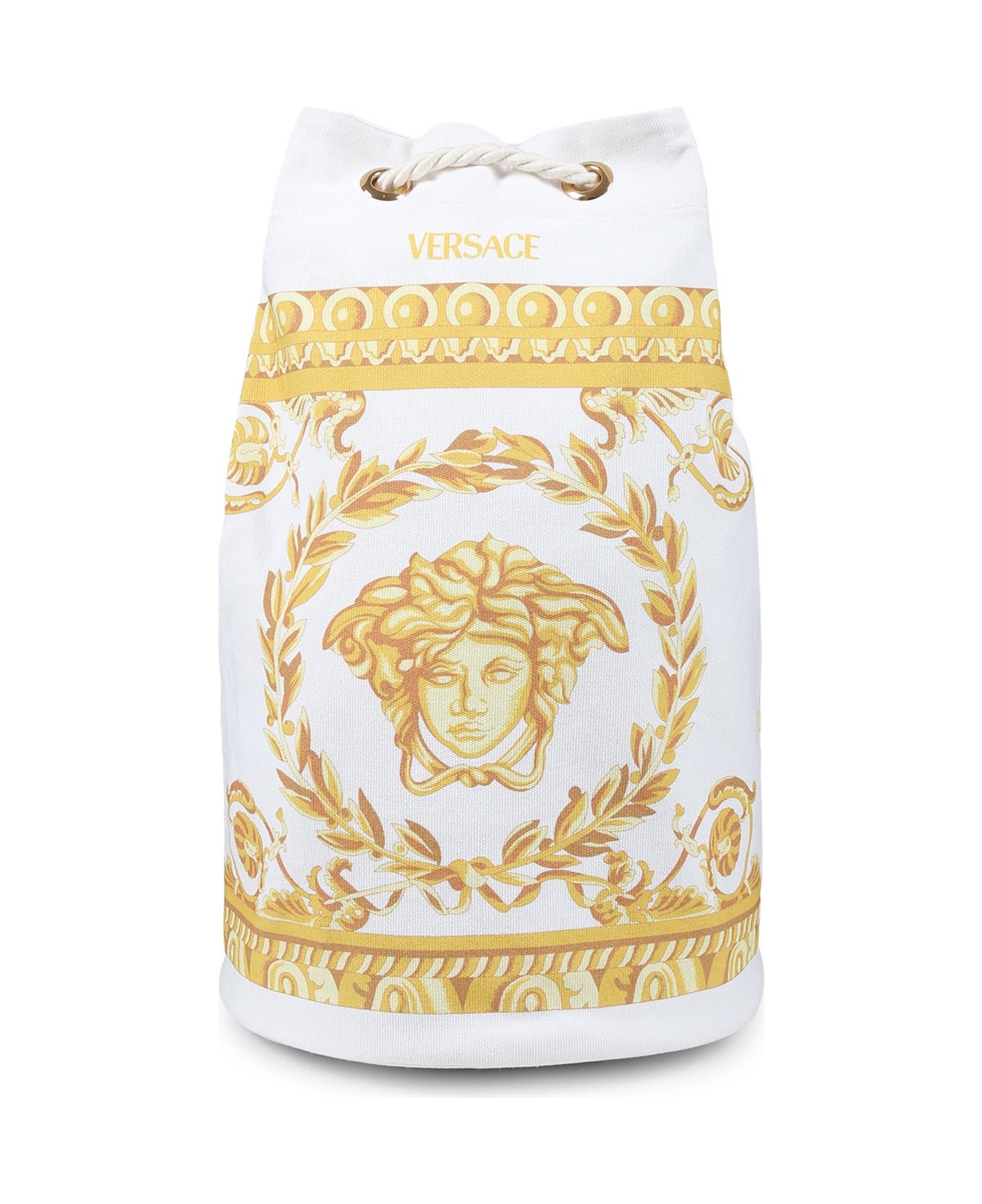 White beach bag from the luxury brand Versace, in canvas, with shoulder straps. It is embellished with Versace logo, iconic Medusa and baroque print.