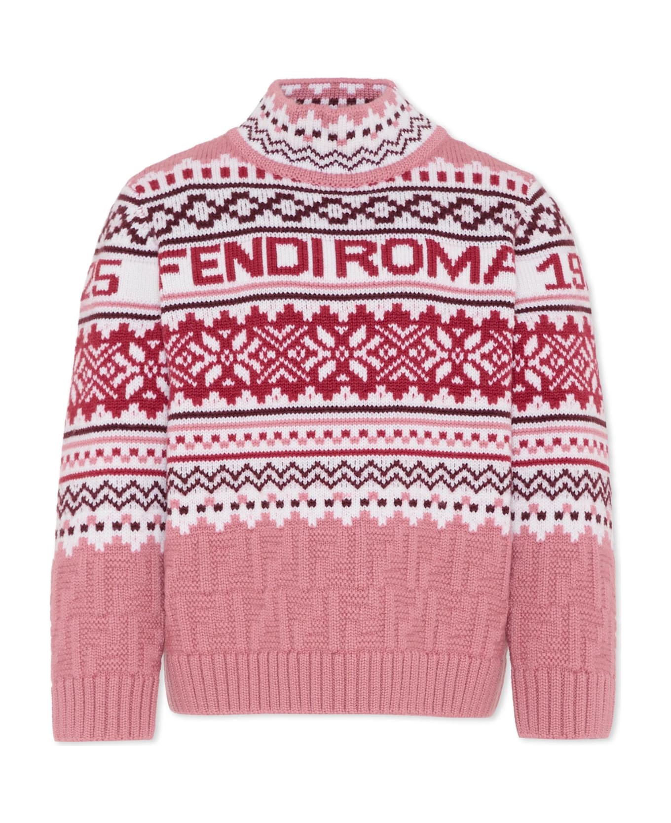 Pink sweater from the luxury brand Fendi Kids, made of wool, long sleeves, a ribbed crew neck, cuffs, and hem. It is embellished with a pink Fendi Roma logo and a Nordic jacquard motif.