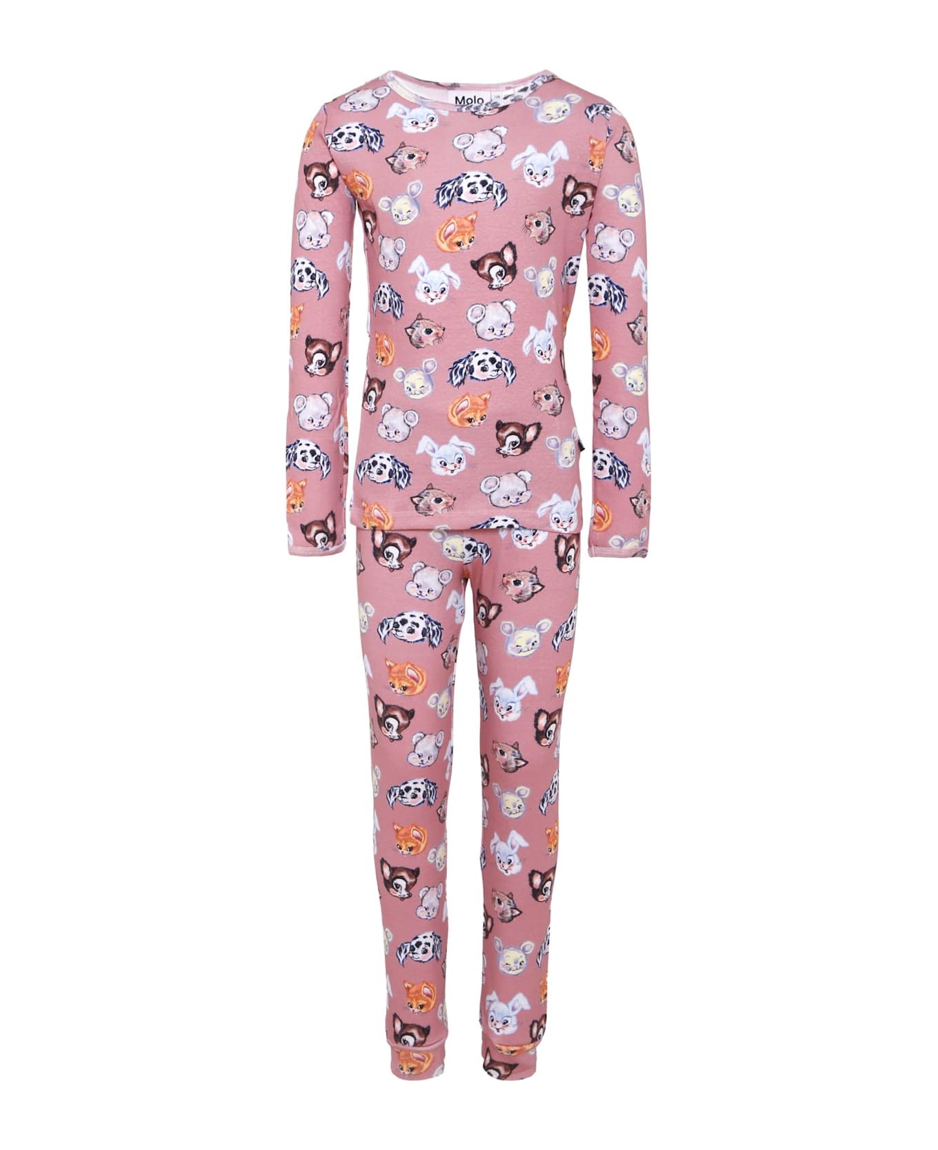 Pink organic cotton blend pyjamas, composed of a t-shirt and trousers. T-shirt with long sleeves and ribbed crew neck; trousers with elasticated waist. It is embellished with an all-over animal print.
