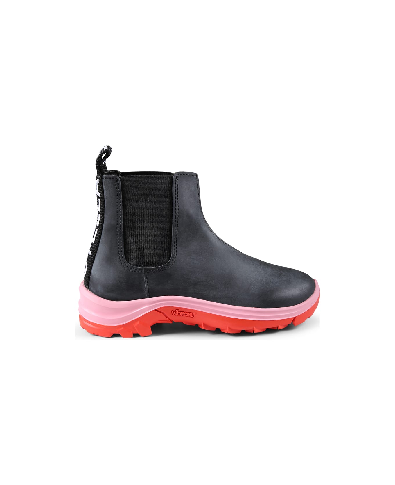 Black rubber boots with a worn effect, with red and pink rubber sole, elasticated details on the sides and a branded tongue on the back.